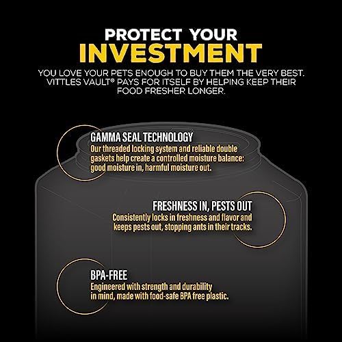 • SAY GOODBYE TO PESKY PESTS: In addition to locking in flavor and pet food smells, Gamma Seal Technology keeps ants and other pests out of this pet food storage container. Vittles Vault is perfect for storing birdseed, cat and dog kibble, goat feed, and more dry food.