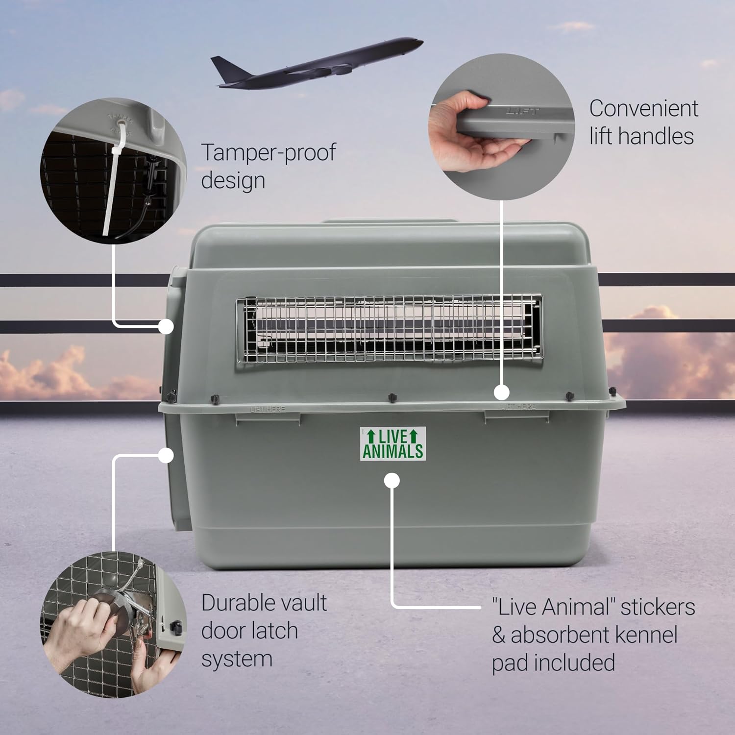 • FIRST-CLASS COMFORT FOR PETS: The Petmate Sky Kennel meets IATA requirements for live animal transport and meets most airline cargo specifications, providing secure air travel for pets; it includes 360-degree ventilation and tie-down strap holes
