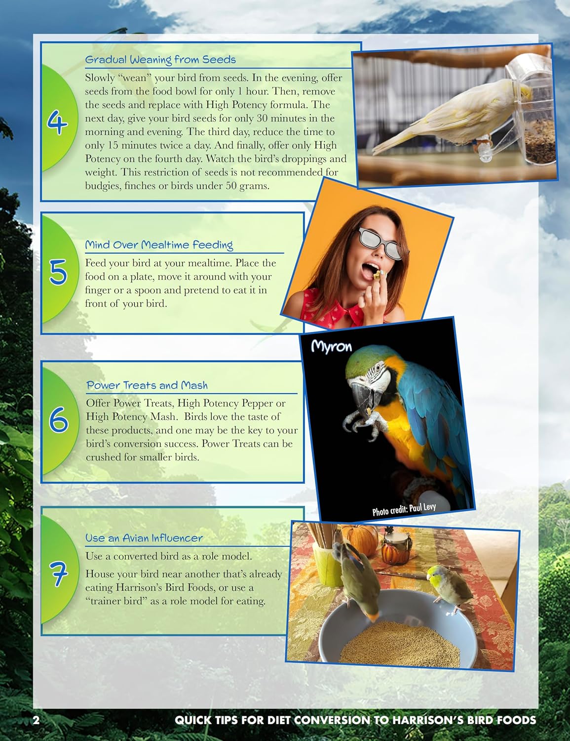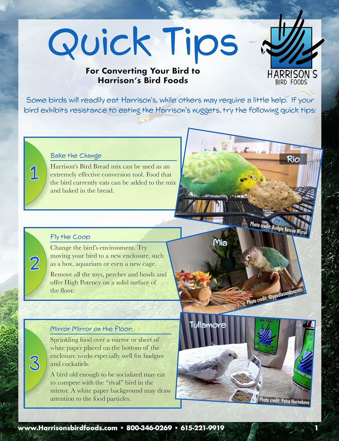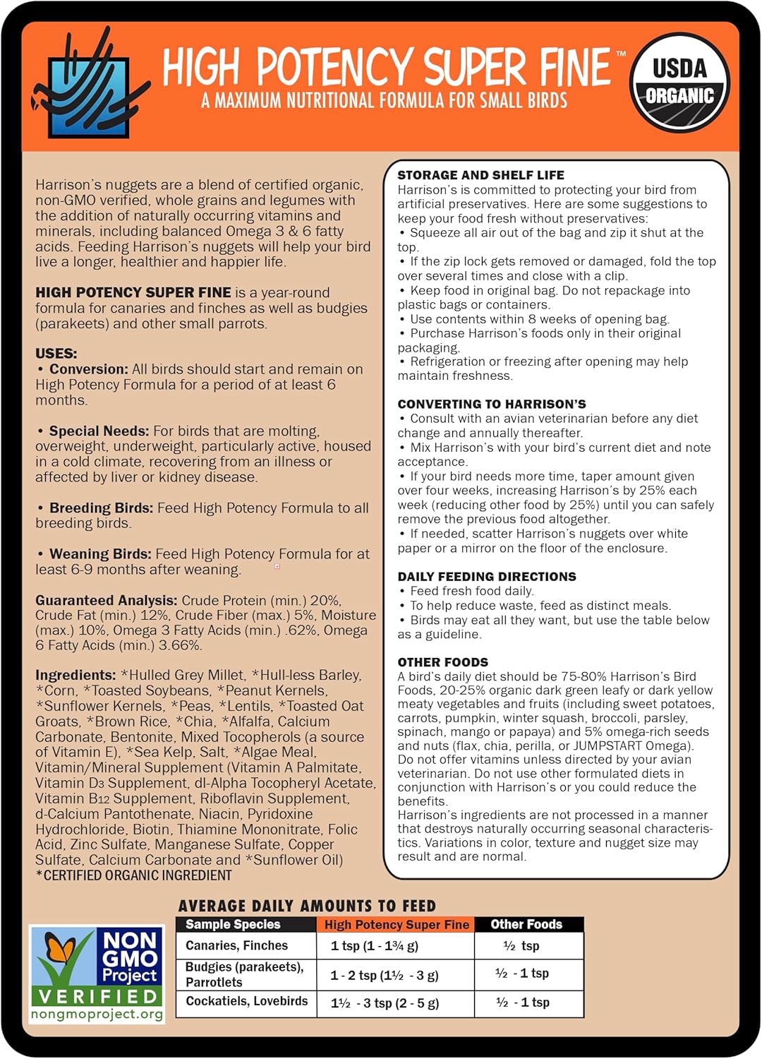 • FOR SMALL BIRDS: Harrison's Bird Foods HIGH POTENCY SUPER FINE, a certified organic, non-GMO formula crafted by avian veterinarians and avian nutritionists for canaries, finches, budgies, parrotlets, cockatiels, lovebirds, and other small birds. It ensures essential nutrition in a nutrient-dense formula for converting to our formula, under 1 year of age, breeding, weaning chicks, recovering from an illness, or molting.