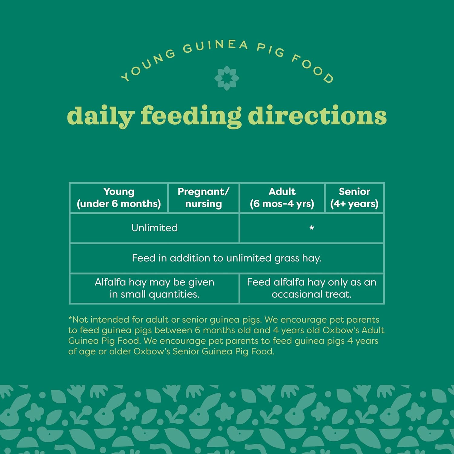 • YOUNG GUINEA PIG FOOD: Immerse your pet in the natural goodness of Oxbow Essentials Young Guinea Pig Food; Our guinea pig pellet formula is designed to deliver essential nutrition to growing, pregnant, and nursing guinea pigs