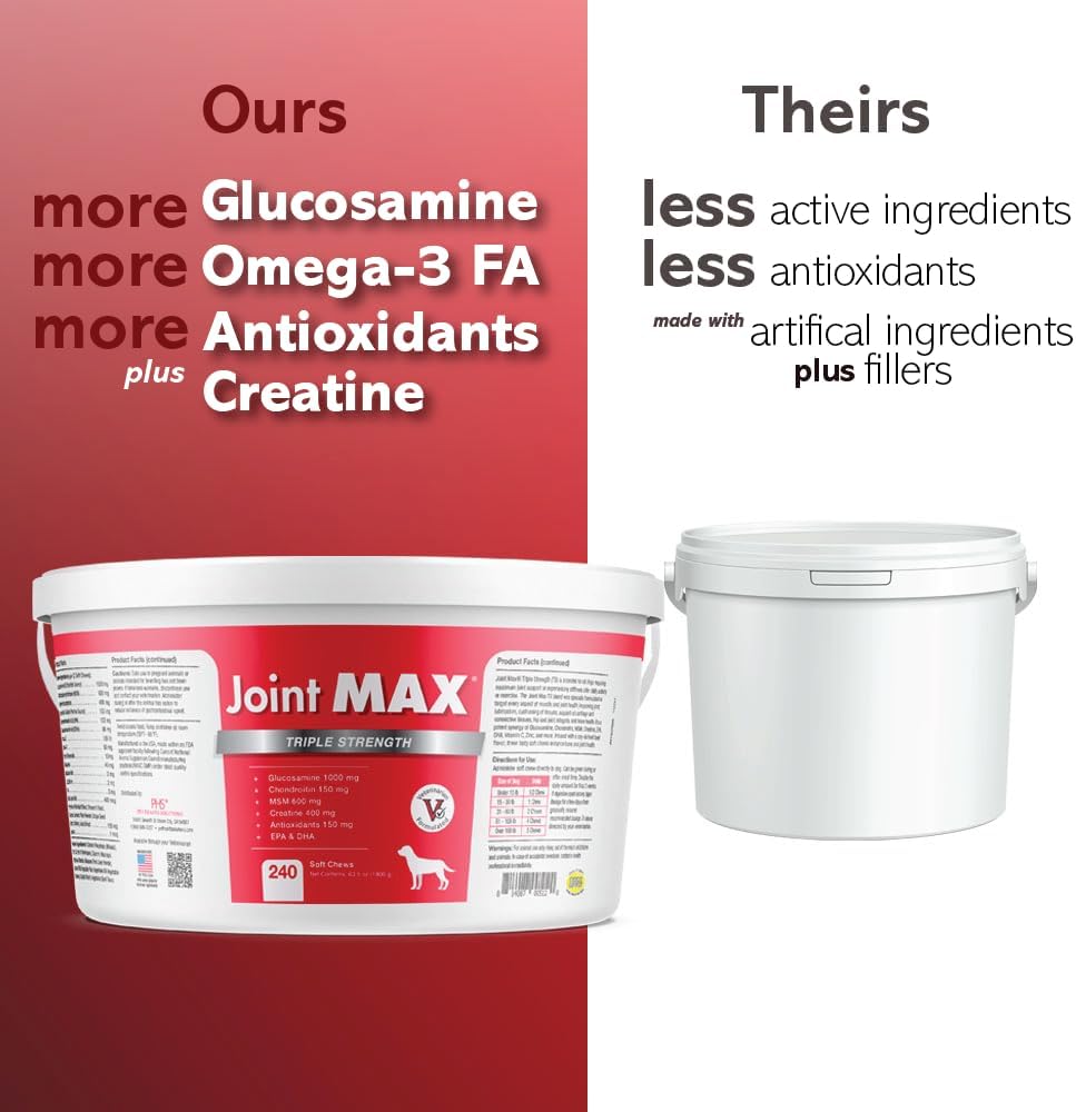 • RELIEF FROM INFLAMMATION - For active dogs or once active dogs that still love to play, Joint MAX Triple Strength uses natural turmeric root to reduce inflammation and relieve joint pain. Your pet will finally rest comfortably after a rough day at the dog park with our super joint enhancer.