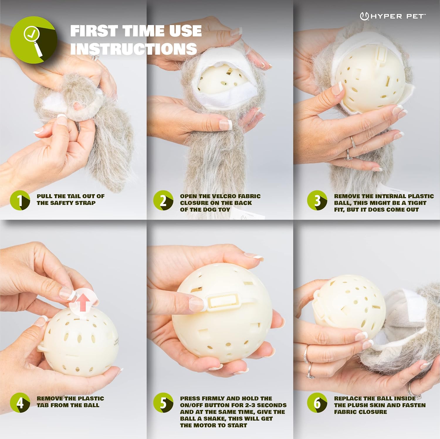 • BATTERY OPERATED PROLONGED PLAY – To change batteries, remove the plastic ball from plush toy cover. Use tab to open the giggle dog toy ball. Remove the battery compartment and insert 3 AAA batteries. This interactive dog toy has an automatic stop feature after a period without use to extend battery life. (Batteries are included with the Hyper Pet Doggie Tail)
