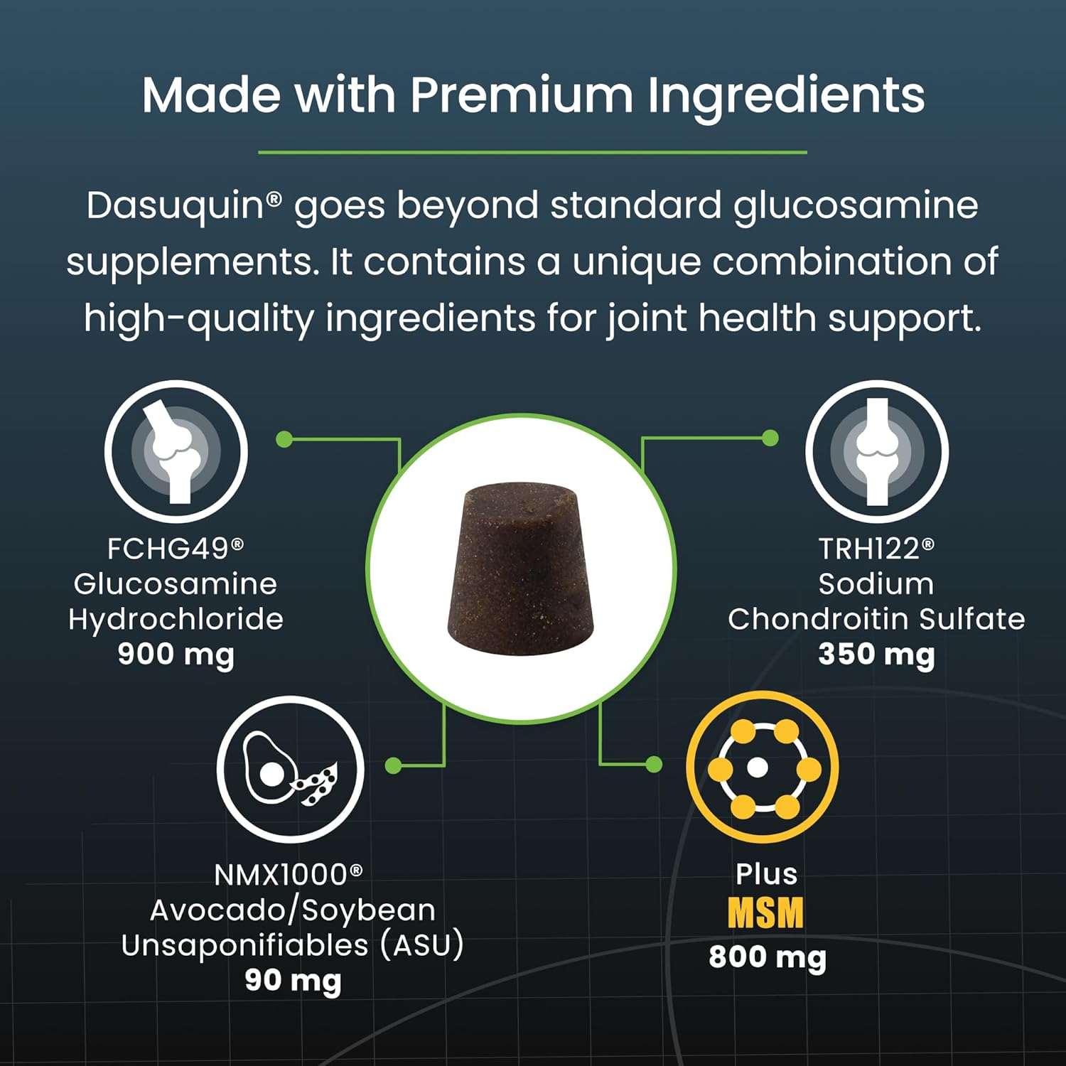 • Better Together with ASU - Dasuquin goes beyond standard glucosamine supplements with avocado/soybean unsaponifiables (ASU), a unique ingredient that works synergistically with glucosamine and chondroitin to help support healthy joints and cartilage.