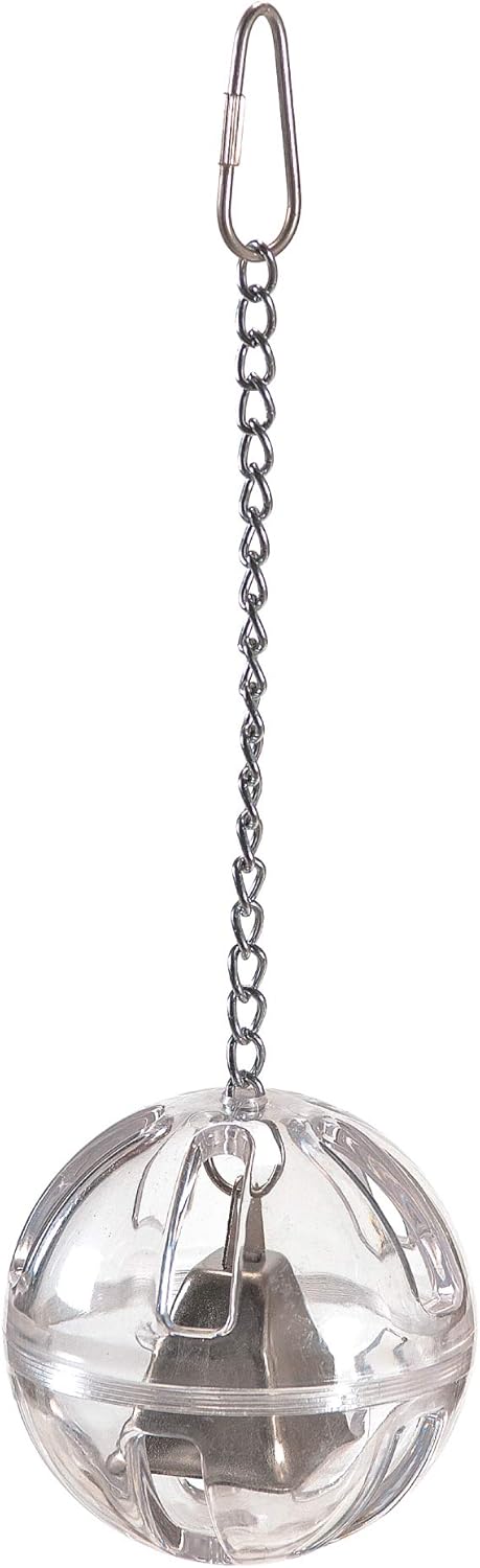 • ENGAGING: Fill the slotted polycarbonate ball of this parrot toy with bird treats for your bird to fish out; This hanging foraging toy doubles as a noise maker to engage your pet bird for hours.