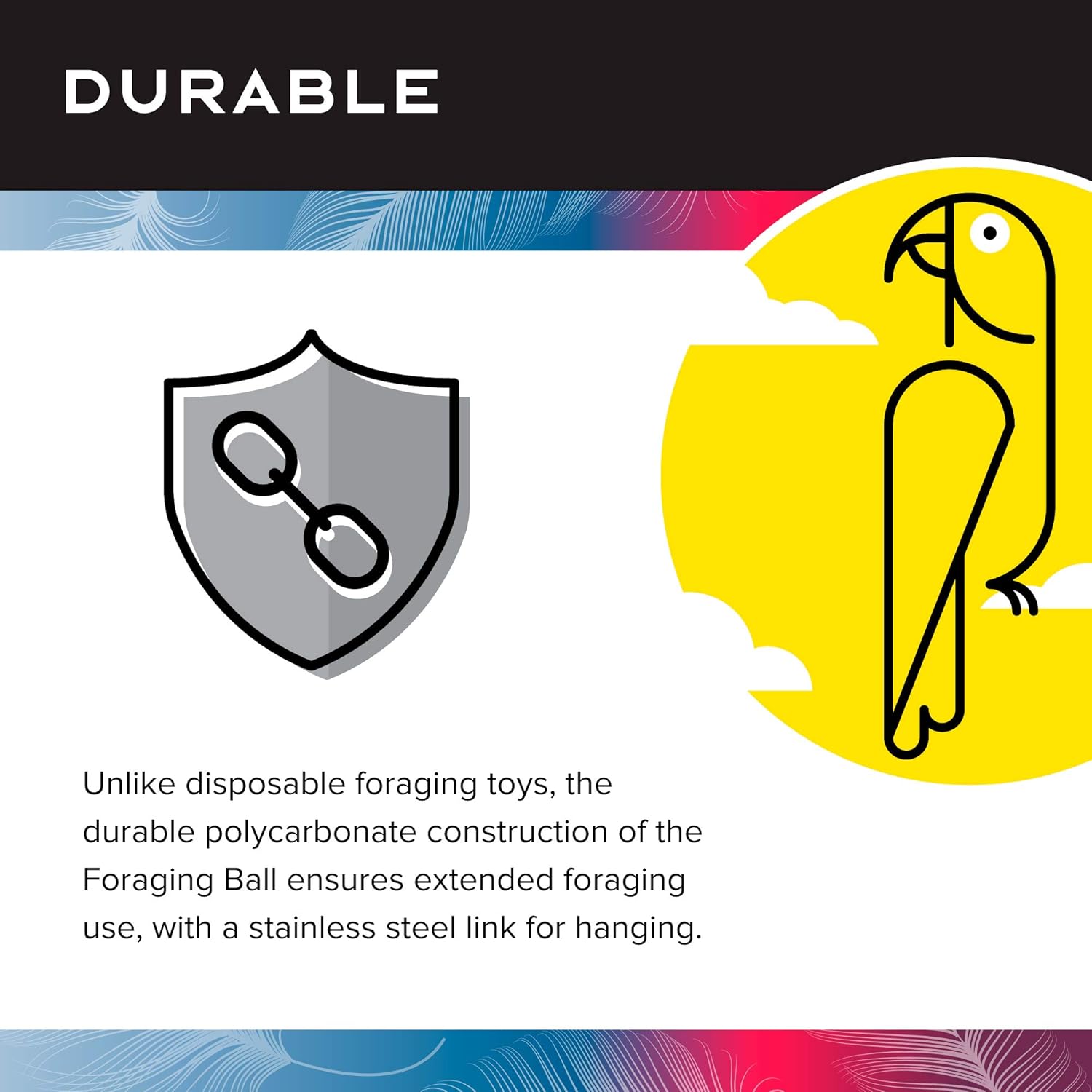 • DURABLE: Unlike disposable foraging bird toys, the durable polycarbonate construction of the Foraging Ball ensures extended foraging use, with a stainless steel link for hanging