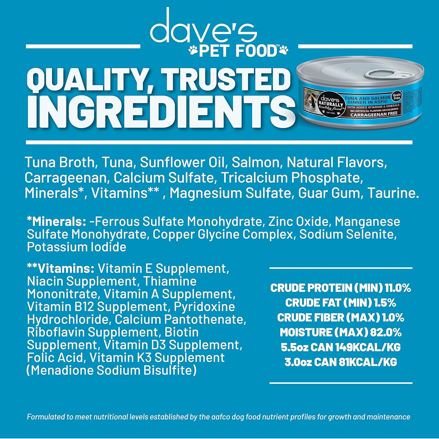 • ADDED VITAMINS & MINERALS. With flavor and nutrition at the forefront, your cat will love the taste of Dave’s nutrient-dense recipe.
