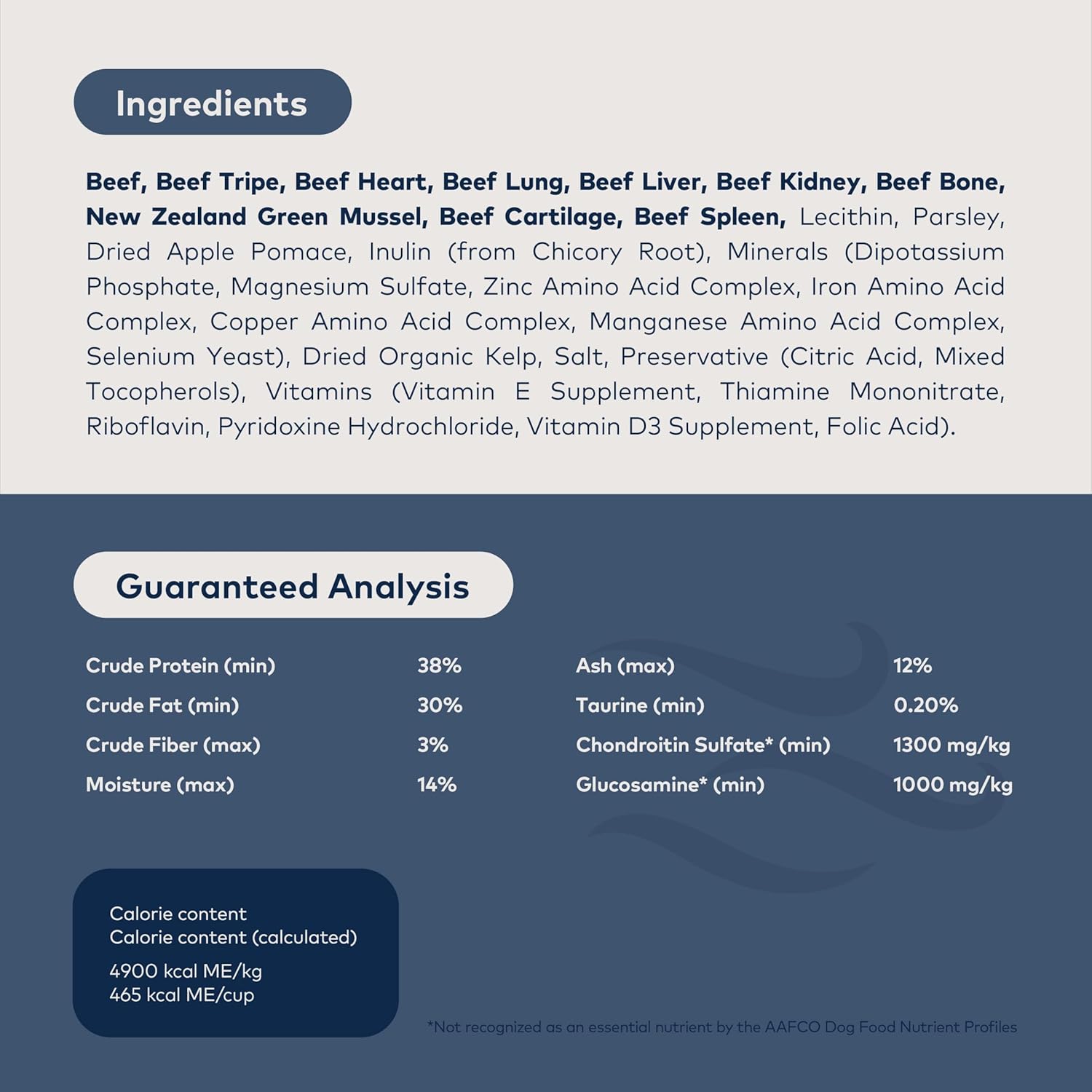 • HIGH PROTEIN, NUTRIENT DENSE: Featuring free-range Beef, Organs, Bone, and New Zealand Green Mussels, this grain-free dog food delivers nutrition with a mouth-watering taste for all dogs. Gentle air dried processing retains the goodness of the raw ingredients. This food offers stimulating crunchy texture small enough for puppy food but soft enough for senior dog food.