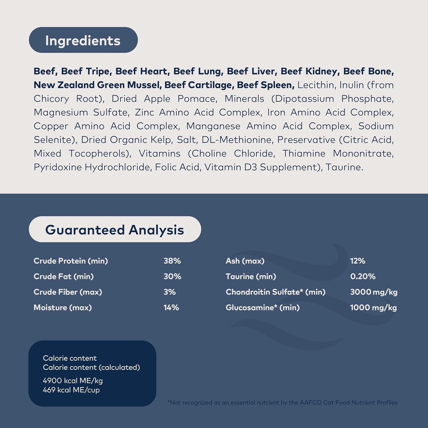 • HIGH PROTEIN, NUTRIENT DENSE: Featuring 96% free-range Beef, Organs, Bone, and New Zealand Green Mussels, this grain-free cat food delivers nutrition with a mouth-watering taste for all cats. Gentle air dried processing retains the goodness of the raw ingredients. This food supports indoor cat food needs and is perfect for all life stages, from kitten food to senior cats.
