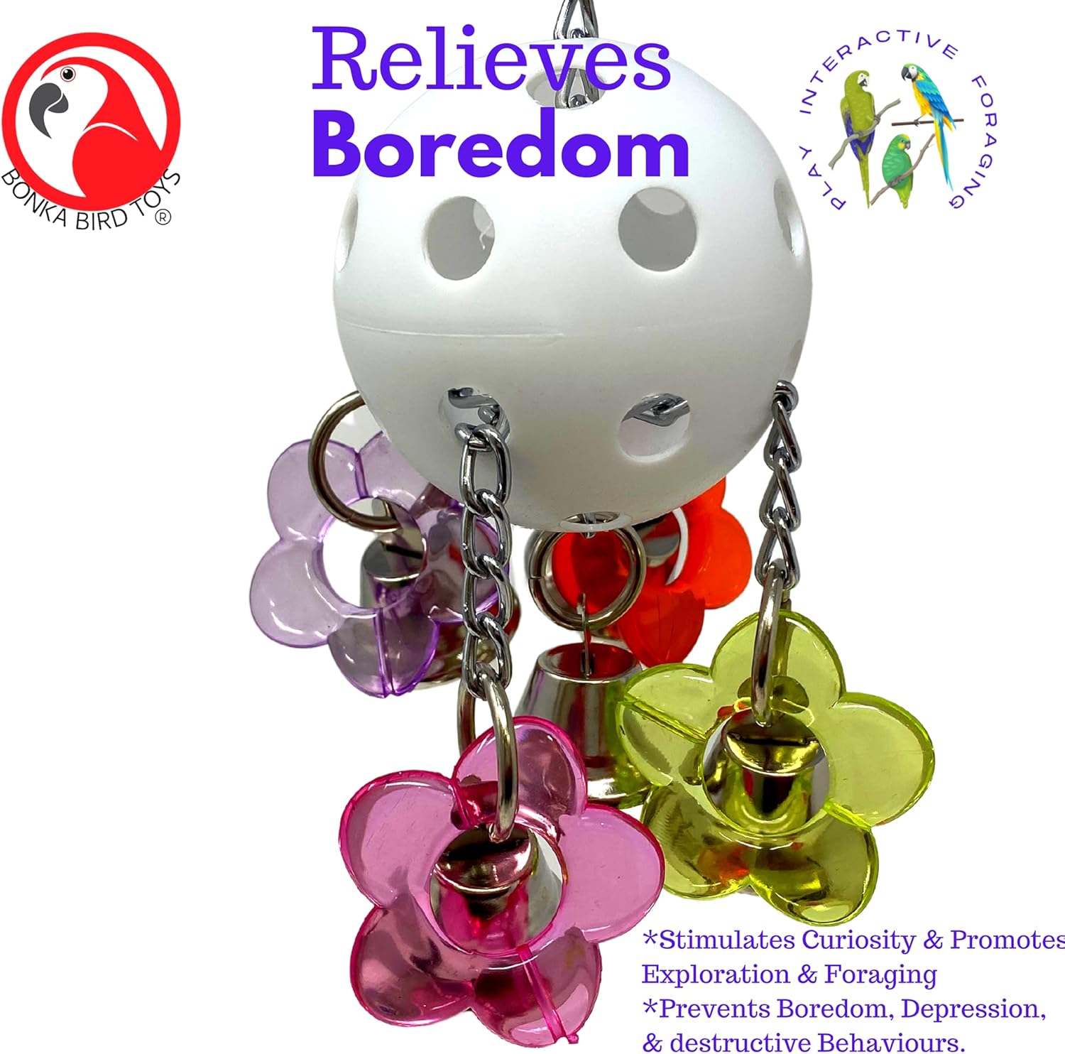 • This durable bird toy provides a fun and colorful interactive experience for your pet bird.