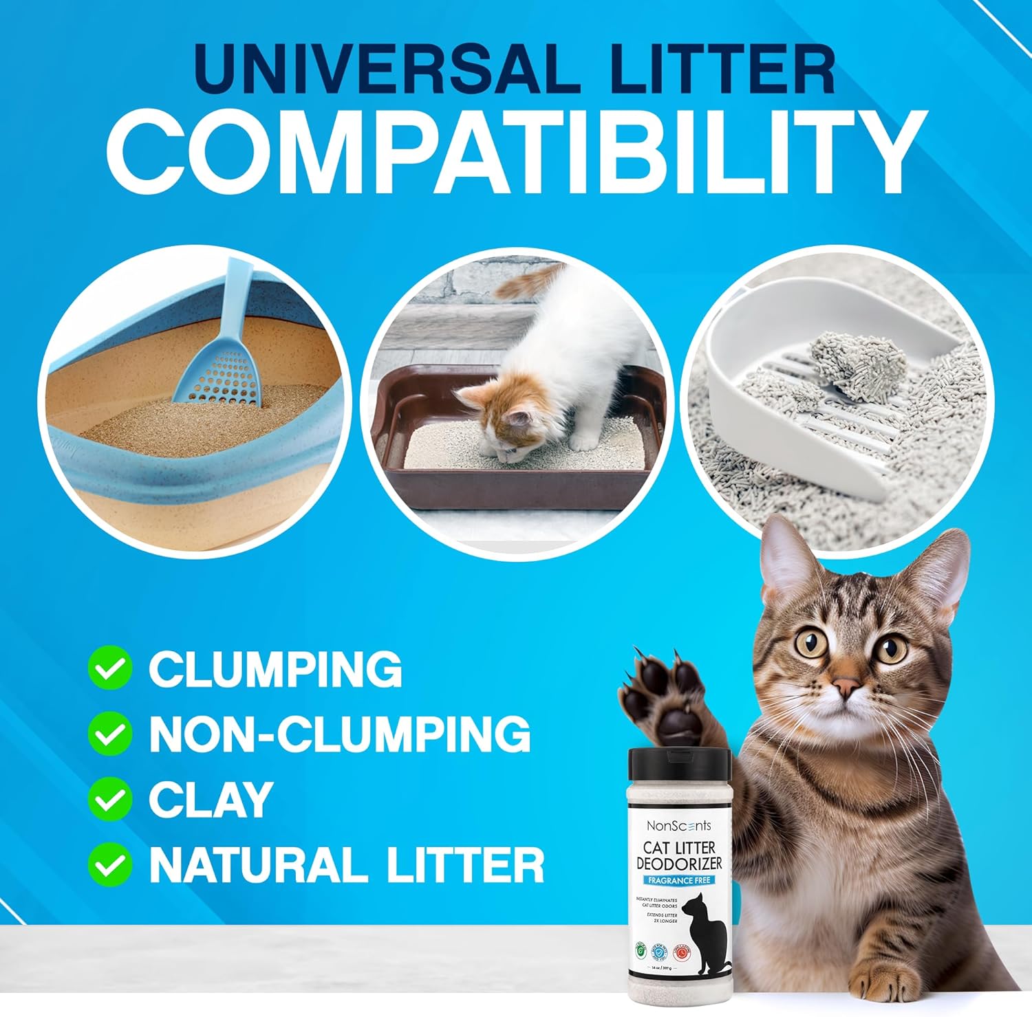 • EXTENDED LITTER LIFE: Save time and money with our deodorizer, which not only eliminates odors but also extends the life of your cat litter. Reducing the need for frequent litter changes results in reduced litter consumption. Compatible with various litter types ensuring efficient moisture-wicking and enabling longer intervals between cleanings.