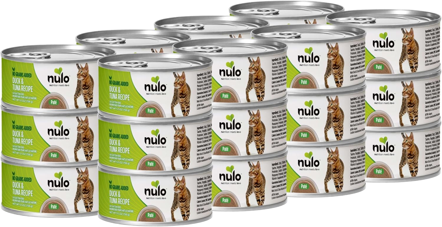 • DUCK & TUNA RECIPE cans - Nulo Freestyle Cat & Kitten Wet Pate Canned Cat Food features our proprietary blend of grain-free proteins and vitamins ideal for cats with diagnosed grain allergies and sensitivities. Pack of 24, 5.5 Oz each.