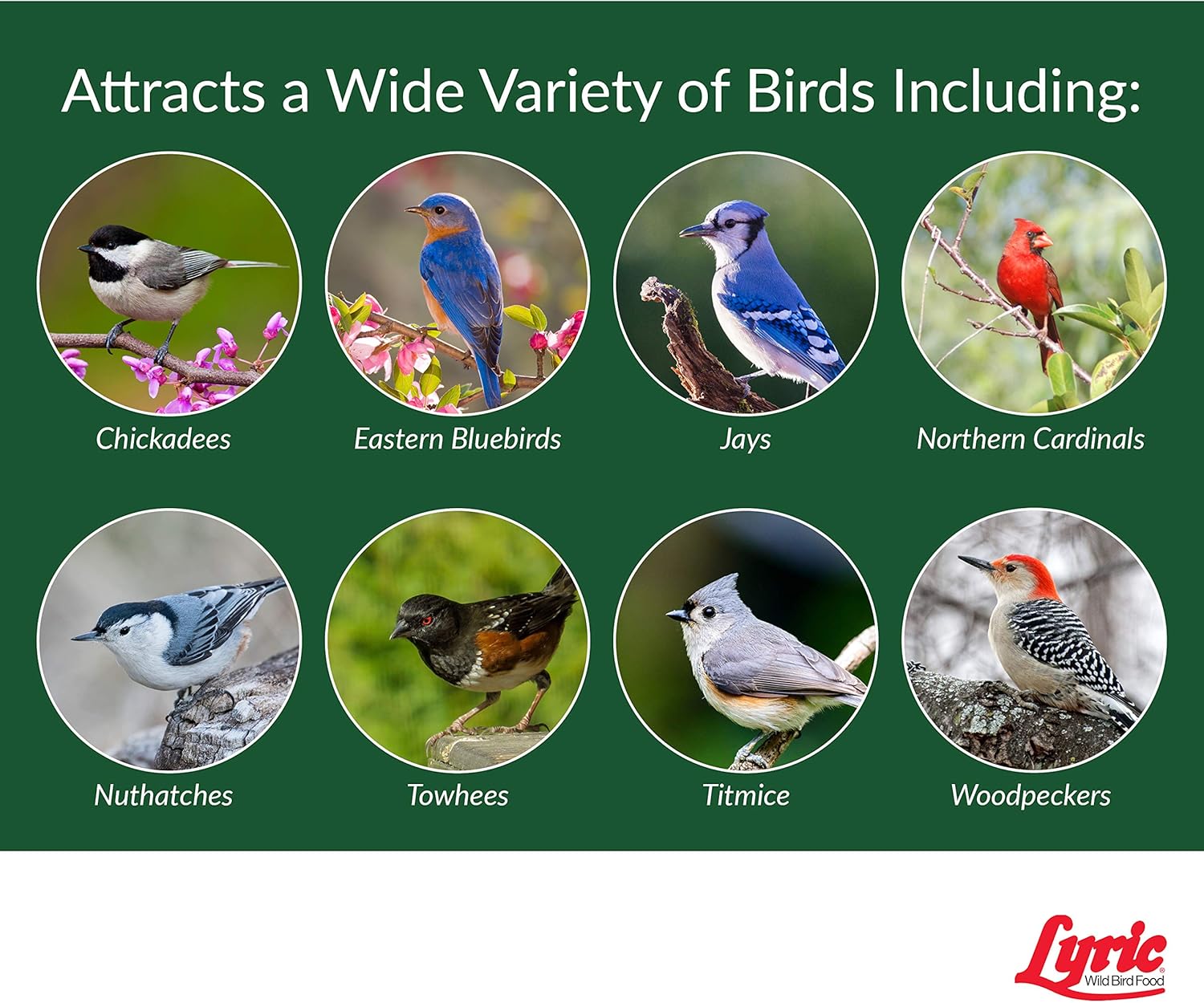 • Attracts wild songbirds like bluebirds, buntings, chickadees, flickers, grosbeaks, house finches, jays, nuthatches, titmice, towhees, woodpeckers, and more