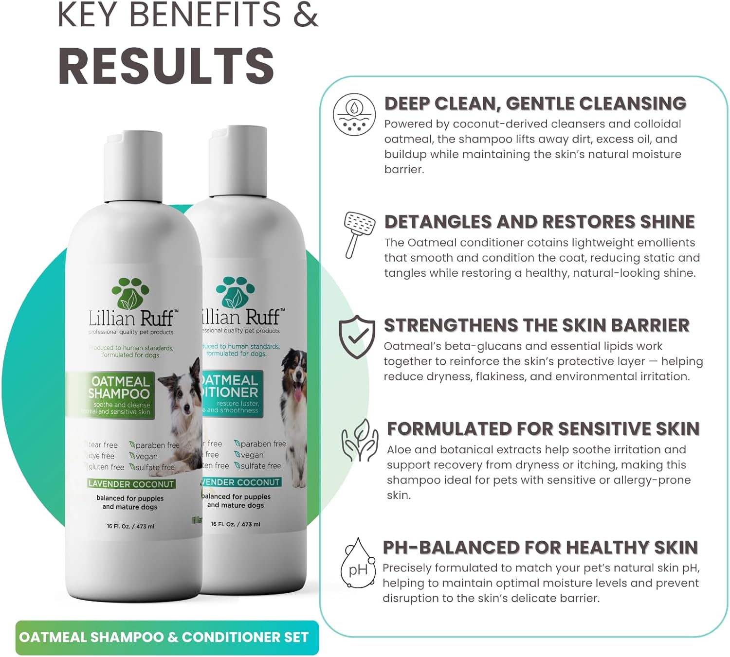 Lillian Ruff PRO Formula Deodorizing Oatmeal Dog Shampoo & Conditioner Set - Calm Itching & Allergies, Ultra-Nourishing Dry Skin Relief - Oatmeal, Aloe, Coconut Oil, Lavender & Provitamin B5, USA Made