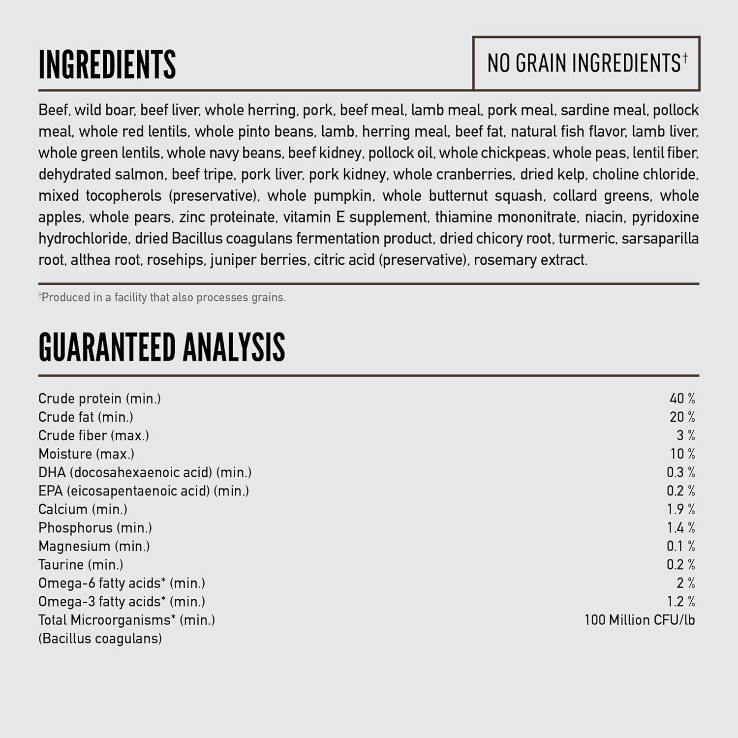 • First five ingredients are fresh or raw*** beef, pork, whole mackerel, beef liver and wild boar