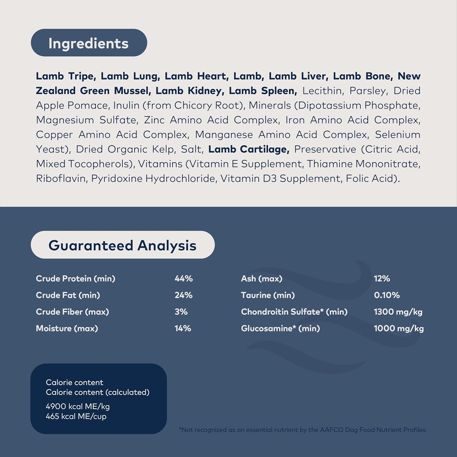 • HIGH PROTEIN, NUTRIENT DENSE: Featuring free-range Lamb, Organs with extra Tripe to support digestion, Bone, and New Zealand Green Mussels, this grain-free dog food delivers nutrition with a mouth-watering taste for all dogs. Gentle air dried processing retains the goodness of the raw ingredients. This food offers stimulating crunchy texture small enough for puppy food but soft enough for senior dog food.