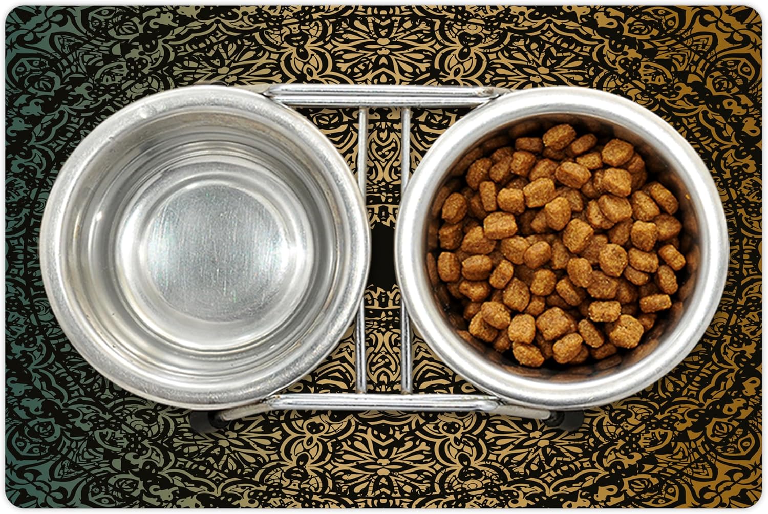 Lunarable Mandala Pet Mat for Food and Water, Round Design Detailed Floral Pattern in Earthy Tones, Non-Slip Rubber Mat for Dogs and Cats, 18" X 12", Fern Green