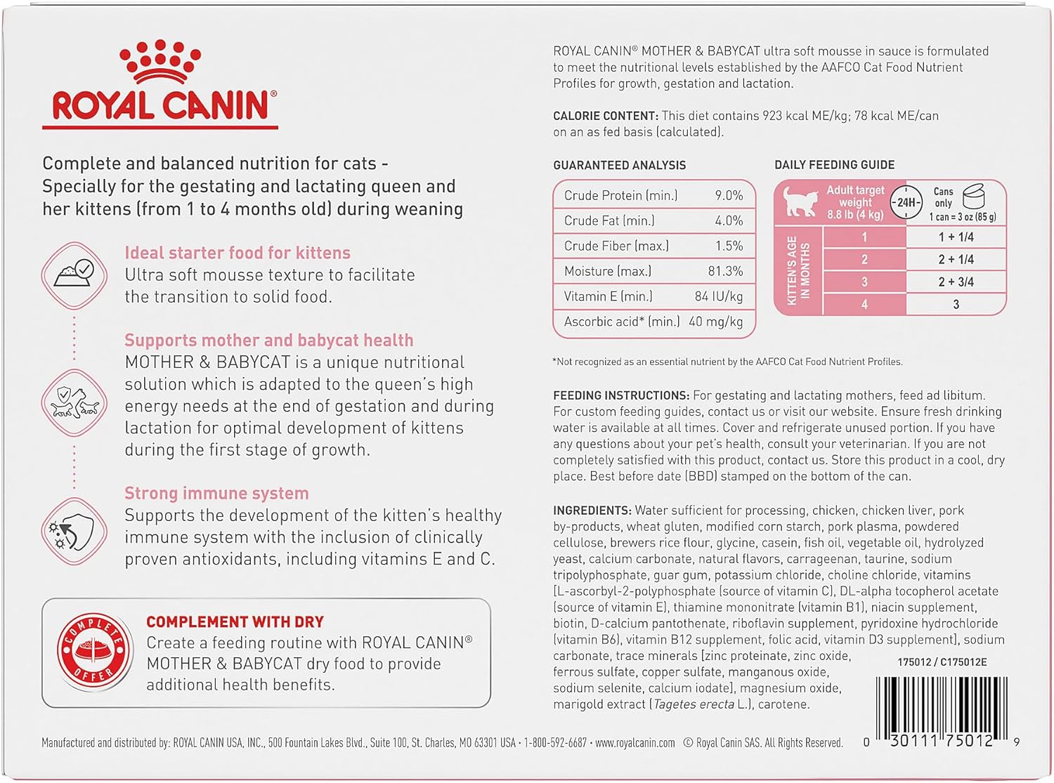 • SUPPORTS MOTHER & BABYCAT HEALTH: Royal Canin Mother & Babycat Ultra Soft Mousse in Sauce Canned Cat Food is a unique nutritional solution that supports mother cats (pregnant or nursing), and the healthy growth and development of newborn kittens (1-4 months)