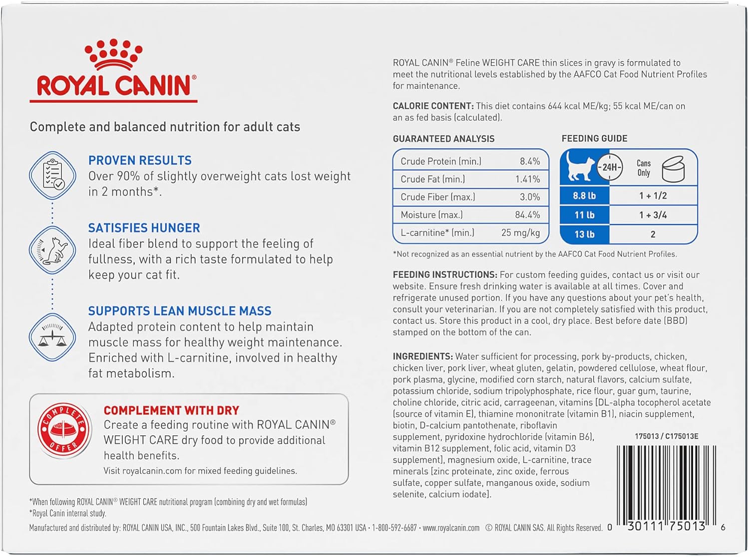 • FOR SLIGHTLY OVERWEIGHT CATS: Royal Canin Feline Weight Care Wet Cat Food delivers complete and balanced nutrition for adult cats that have a tendency to gain weight or that need to lose a little bit of weight