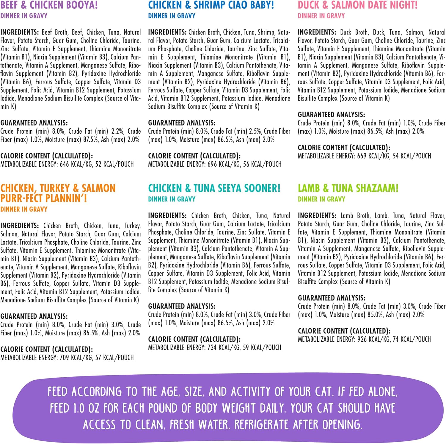• Potluck O' Pouches Variety Pack (2.8oz Pouches, Pack of 12) OMG, Six different flavors in one variety pack! Featuring premium proteins like tuna, chicken, salmon, beef, lamb and duck in a tasty gravy.