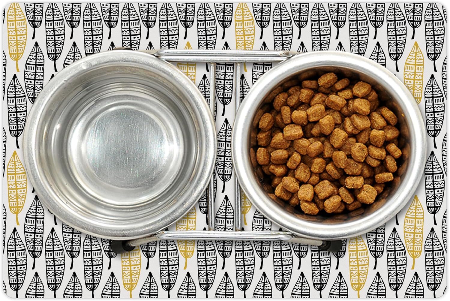 Lunarable Aztec Pet Mat for Food and Water, Modern Graphic of Ornate Hand Drawn Style Old Feather Form with Aztec Lines Print, Non-Slip Rubber Mat for Dogs and Cats, 18" X 12", Charcoal Yellow