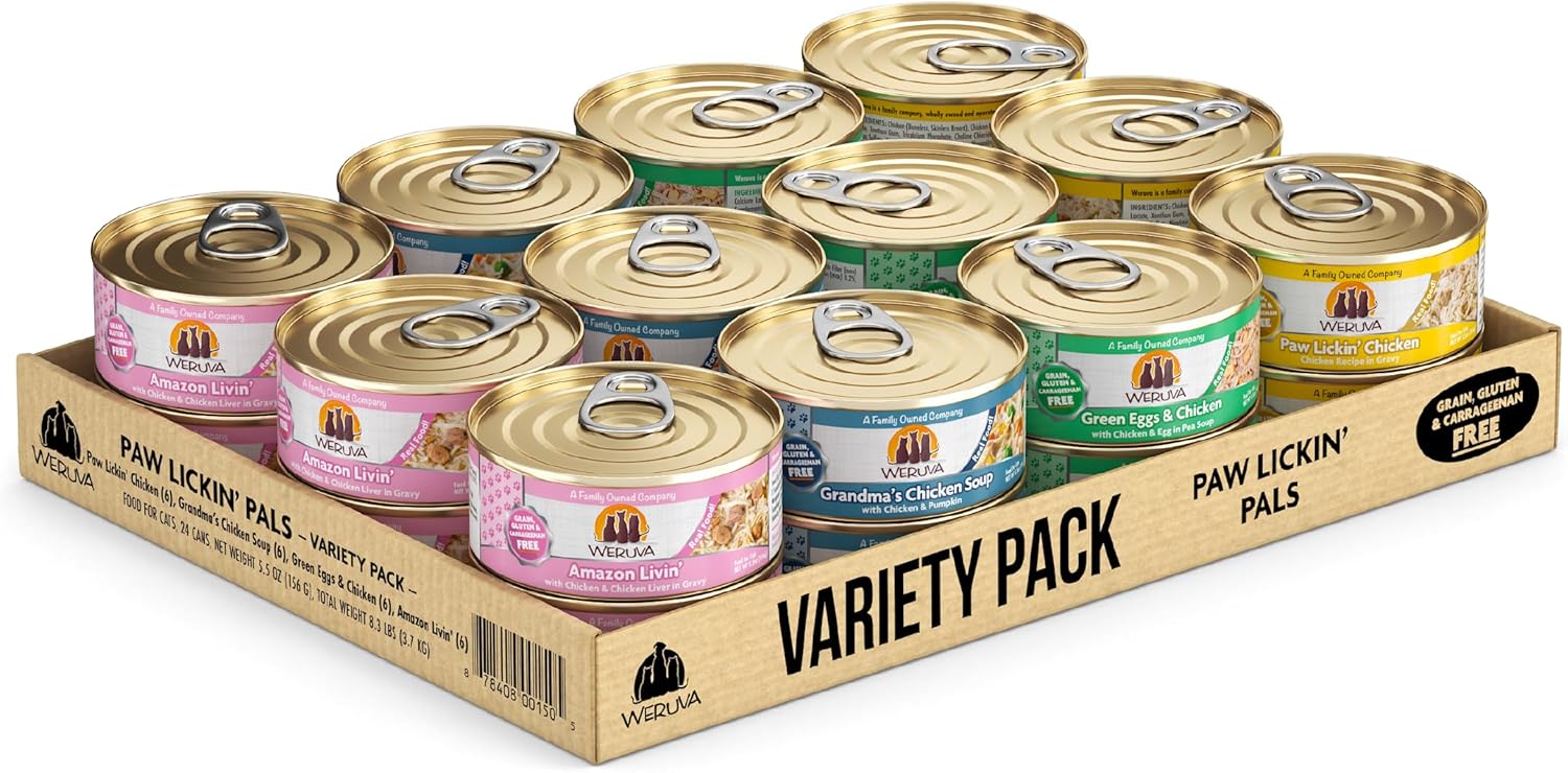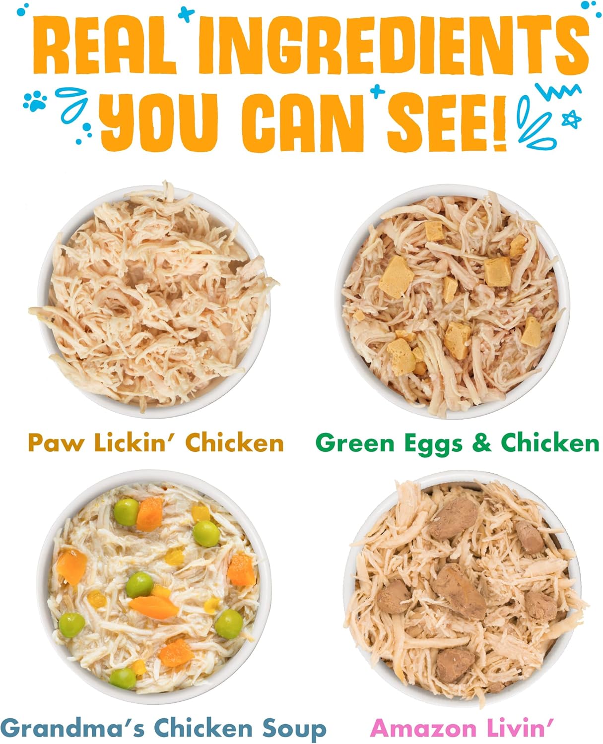 • Variey Pack includes 6 cans of each: Paw Lickin’ Chicken, Green Eggs & Chicken, Grandma’s Chicken Soup and Nine Liver.