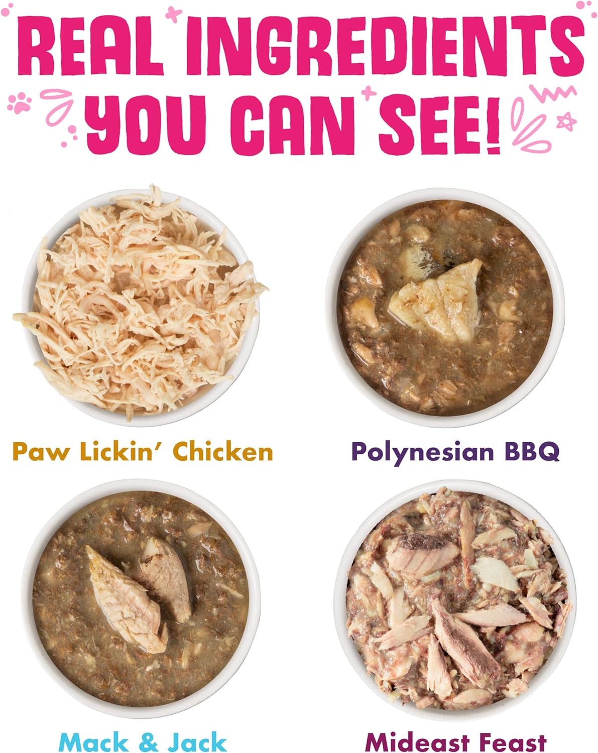 • Variety Pack includes 3 cans of each: Paw Lickin’ Chicken, Mideast Feast, Mack & Jack & Polynesian BBQ