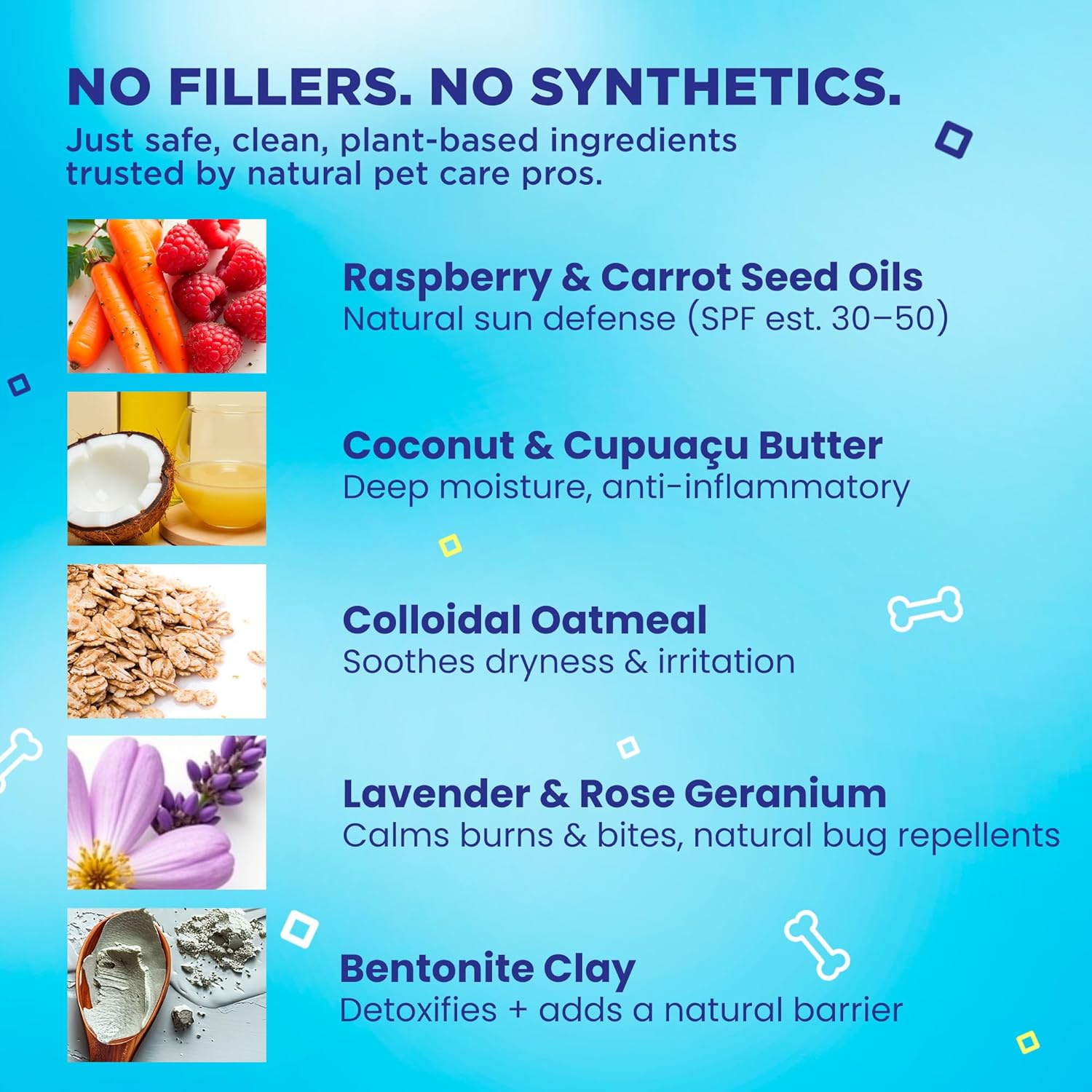 • Sun Protection For Dogs -- Use this year-round to provide dog sunscreen protection. A must-have for your dog camping gear and hunting dog accessories. This balm doubles as a dog moisturizer for dry skin, a dog skin soother, and a dog paw balm.