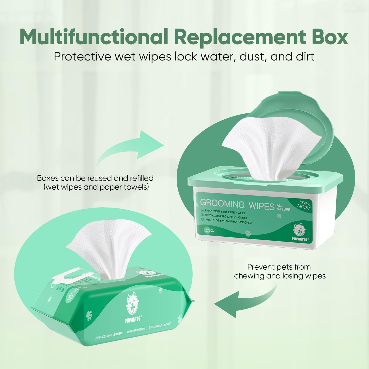 • DELICATE AND EFFICIENT CLEANSING: At PUPMATE, These grooming wipes for dogs & cats, and puppies wipes go beyond cleaning – they embody our commitment to creating a happier, healthier life for pets. Whether it's ridding them of dirt, mud, or a weird smell, our pet wipes work diligently to cleanse their butt, eyes, ears, and paws, ensuring that their four-legged friend feels consistently clean and delightfully refreshed