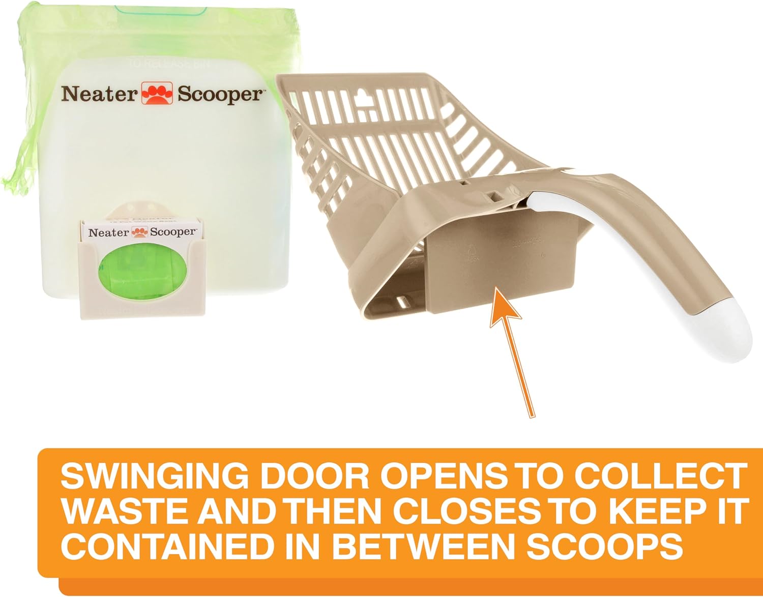 • NO MORE SPILLED LITTER: The Neater Scooper litter box scoop deposits waste directly into a bag, keeping your floors mess-free, reducing dust, and containing odors. Trap door contains waste between scoops. Compatible with all litter types except pellets. Patented & patents pending. Bin measures 6.5” H x 5.75" W x 3.5" D. Made in USA.