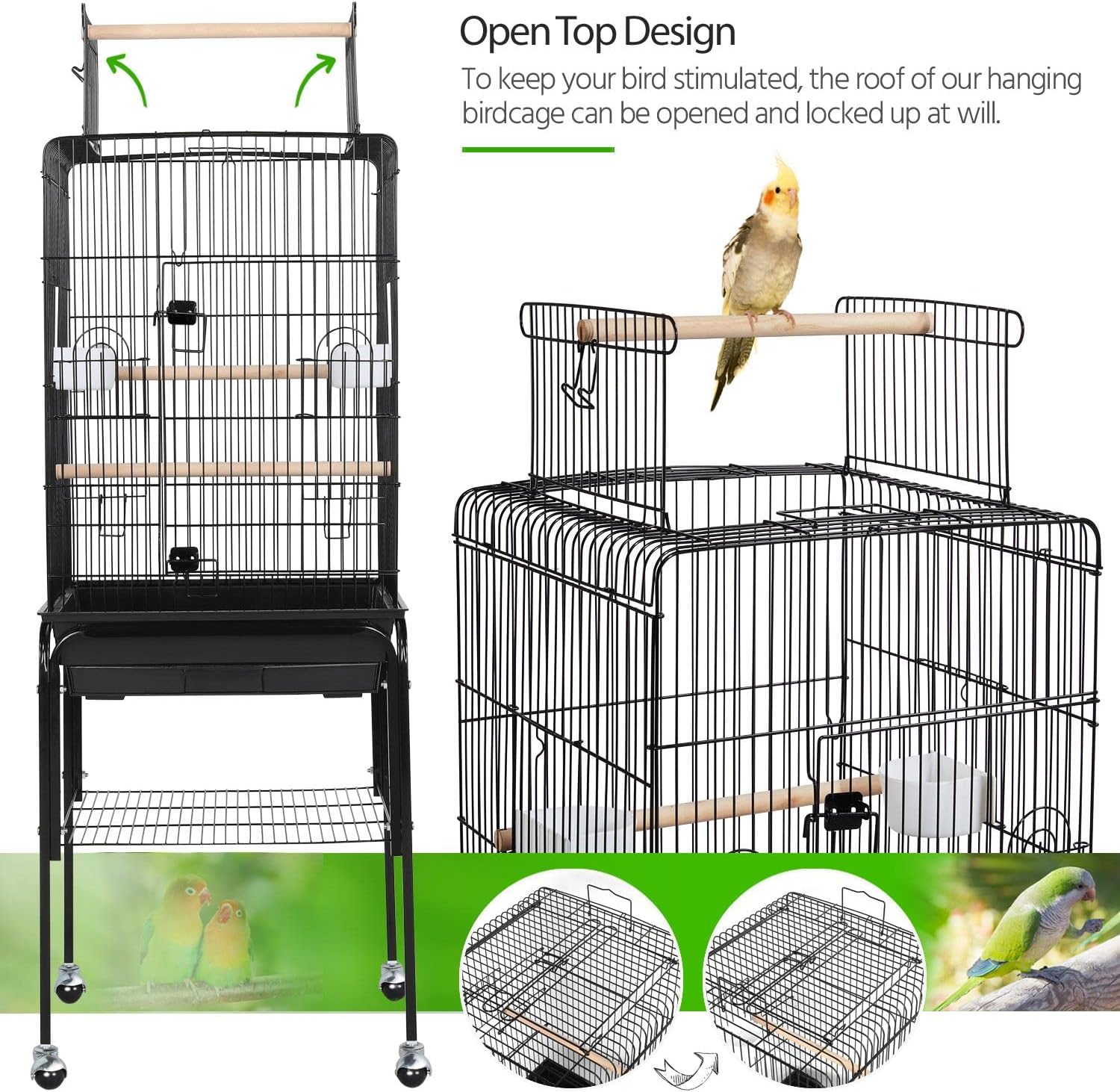 • Interactive Play Top: To keep your bird stimulated and provide both you and your feathery friends with a better interaction way, we upgraded this 47-inch bird cage by adding an easy-to-use play top. It includes a perch that keeps the top doors open for the birds to stand on, and can be closed to give them a safe enclosed home