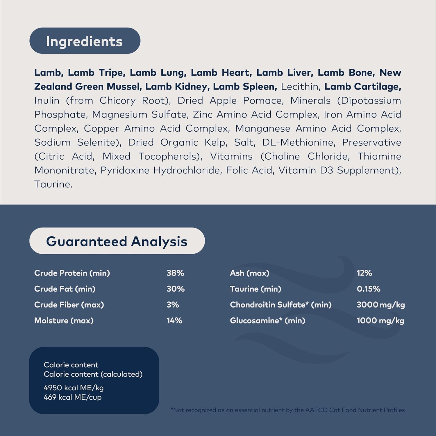 • HIGH PROTEIN, NUTRIENT DENSE: Featuring 96% free-range Lamb, Organs, Bone, and New Zealand Green Mussels, this grain-free cat food delivers nutrition with a mouth-watering taste for all cats. Gentle air dried processing retains the goodness of the raw ingredients. This food supports indoor cat food needs and is perfect for all life stages, from kitten food to senior cats.