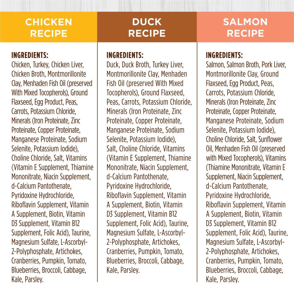 • GRAIN FREE CAT FOOD VARIETY PACK: Each recipe starts with cage free chicken, cage free duck or wild caught salmon. Packed with 95% animal protein for strong, lean muscles and 5% vegetables, fruits and other wholesome ingredients.