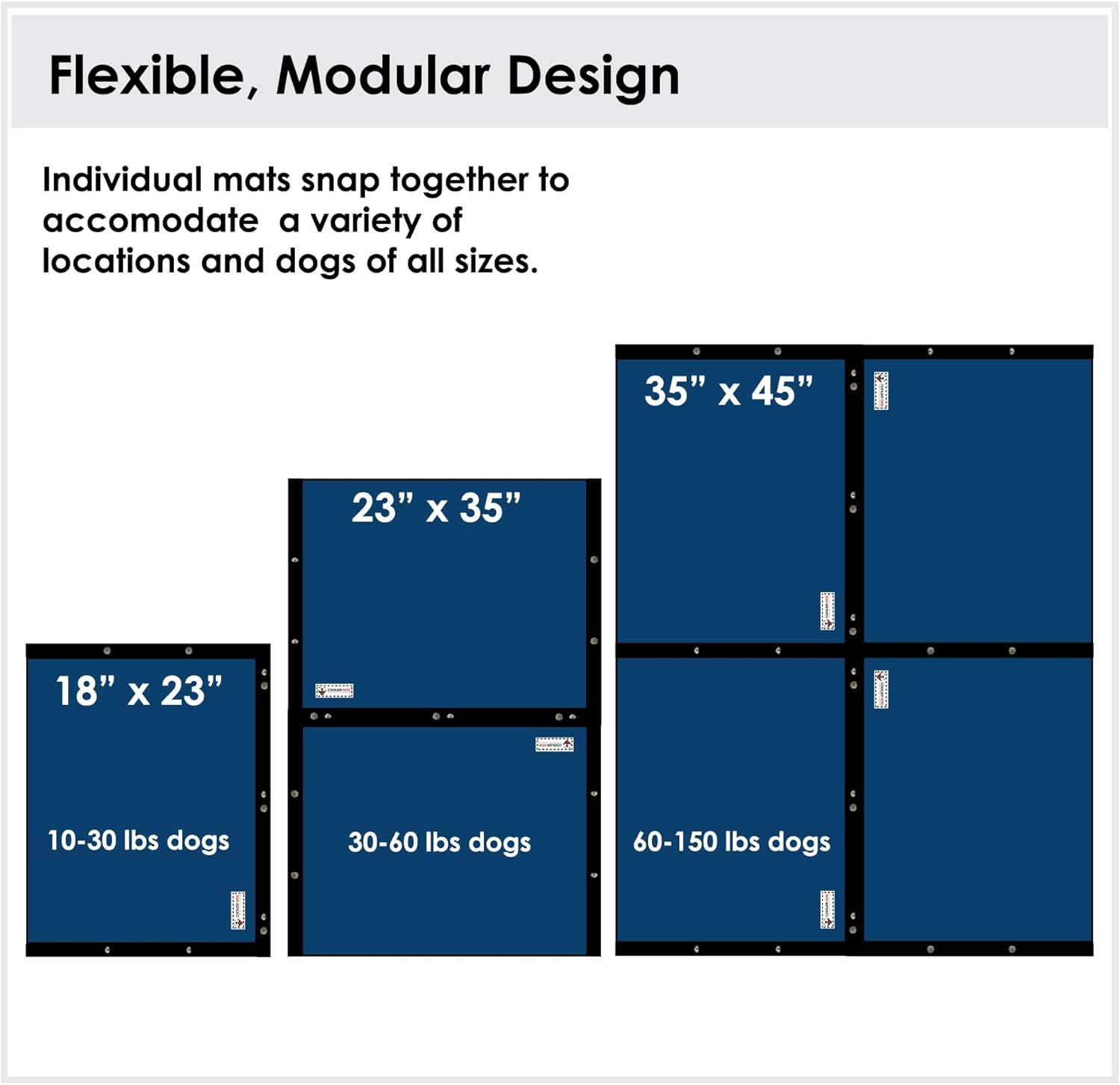 • ROBUST AND MODULAR Made with rip-stop materials, for use indoors or outdoors. Each mat has snaps on three sides to connect multiple mats for larger dogs. Mat cover is machine washable