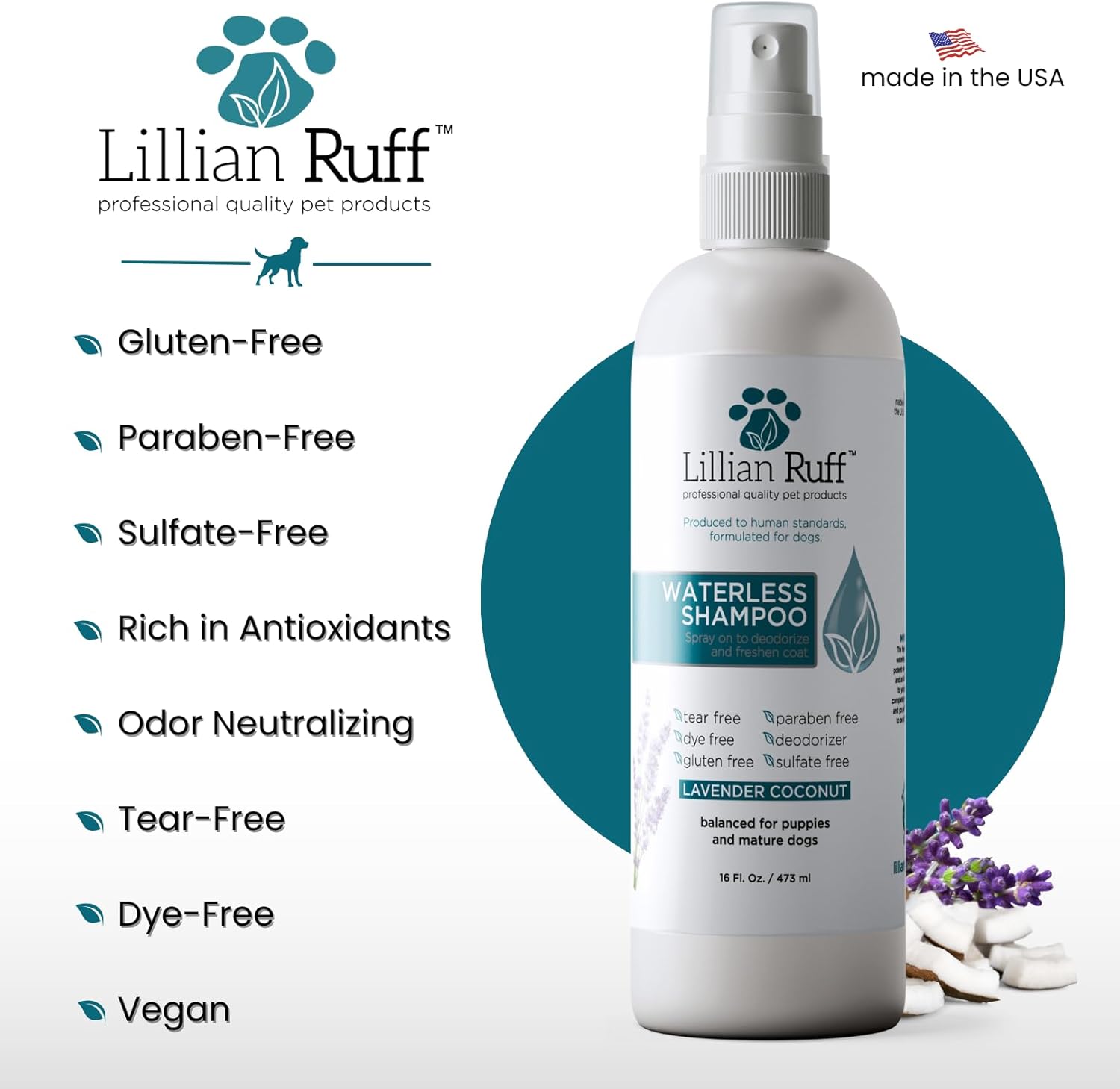 Lillian Ruff Waterless No-Rinse Dog Dry Shampoo Spray with Hydrating Essential Oils - pH-Balanced Dry Shampoo for Dogs - Clean, Condition, Detangle & Deodorize Dry, Sensitive Skin (16oz/Brush)