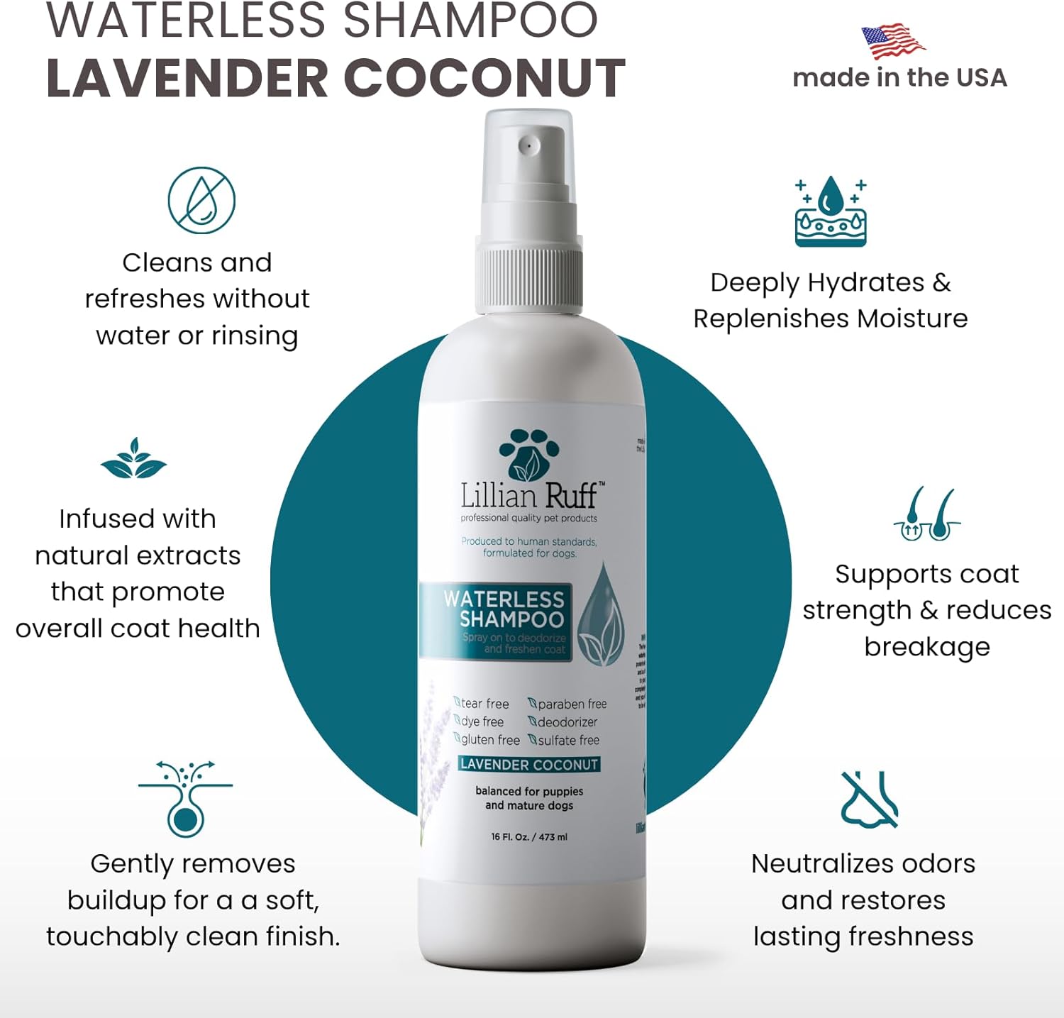 • Safe and Gentle Formulation: Prioritizing your pet's well-being, our Waterless pet shampoo is gentle yet effective. Enriched with Aloe, it is suitable for animals with sensitivities. Tough on dirt and smells, yet gentle on the skin, our Lillian Ruff Waterless Shampoo spray-on dry shampoos provide a comfortable and refreshing grooming experience.