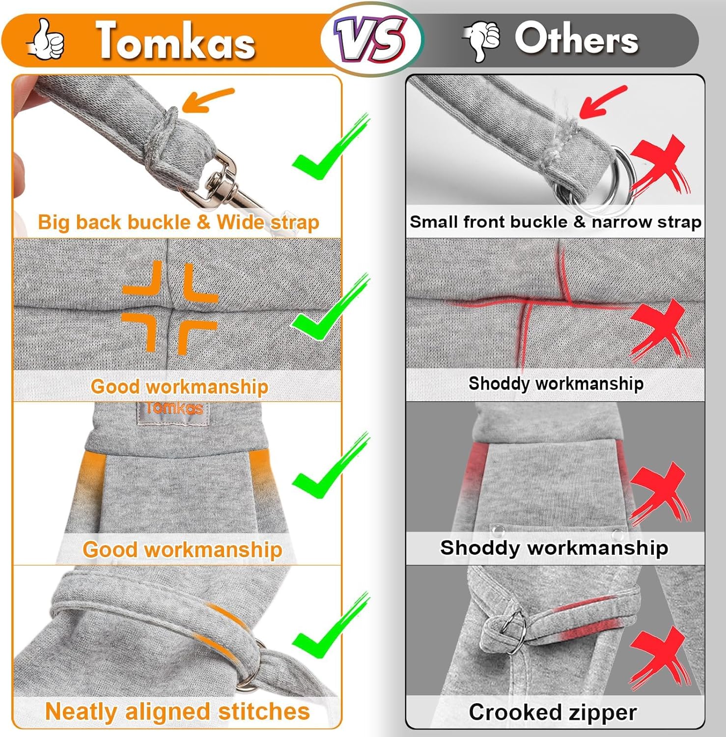 - Sufficient Safety: pets can be easily put into TOMKAS small dog carrier sling after a brief acclimation. You just put your dog in it, attach the safety buckle to the leash buckle on the vest or harness. If your pet wants to jump out of the pouch, the safety belt will stop it from this dangerous behavior and keep your puppy safe. TOMKAS small dog sling is very reliable in terms of safety.Remember, never tie the safety buckle to the collar, it could hurt the dog's neck if it jumps out.