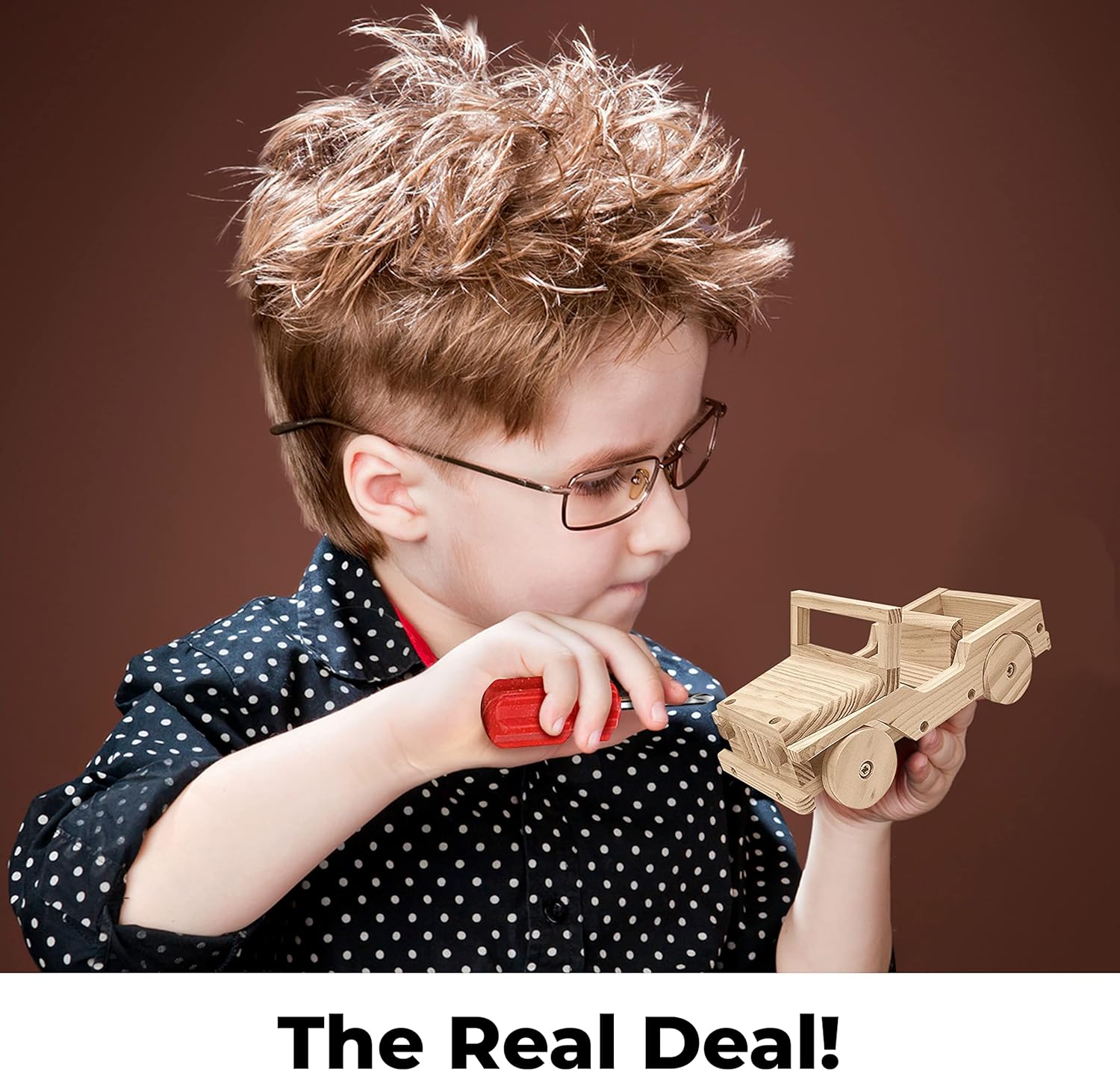 • The Real Deal! Real Wood and Real Tools, Not Just sticking everything together with glue. Wood Pieces are real- not foam or faux wood. Kids will love using the screwdriver and screws to put this together just like adult woodworking!