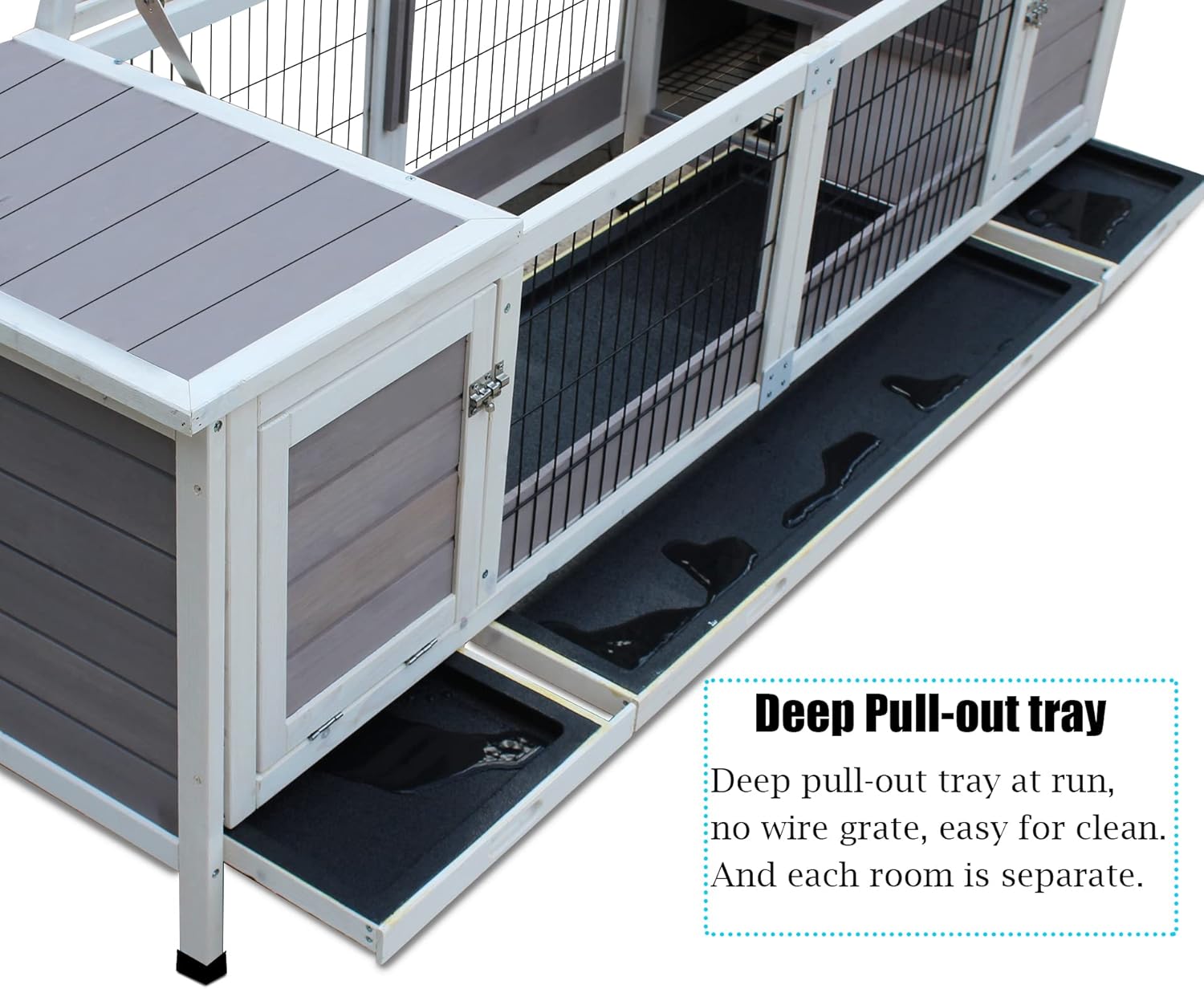 • Easy to clean: It's easy to gain access to the inside by opening the side doors and the top wire for daily cleaning. Your pets can stay in the wood hut with the sliding door locked up while you are cleaning the pull out tray
