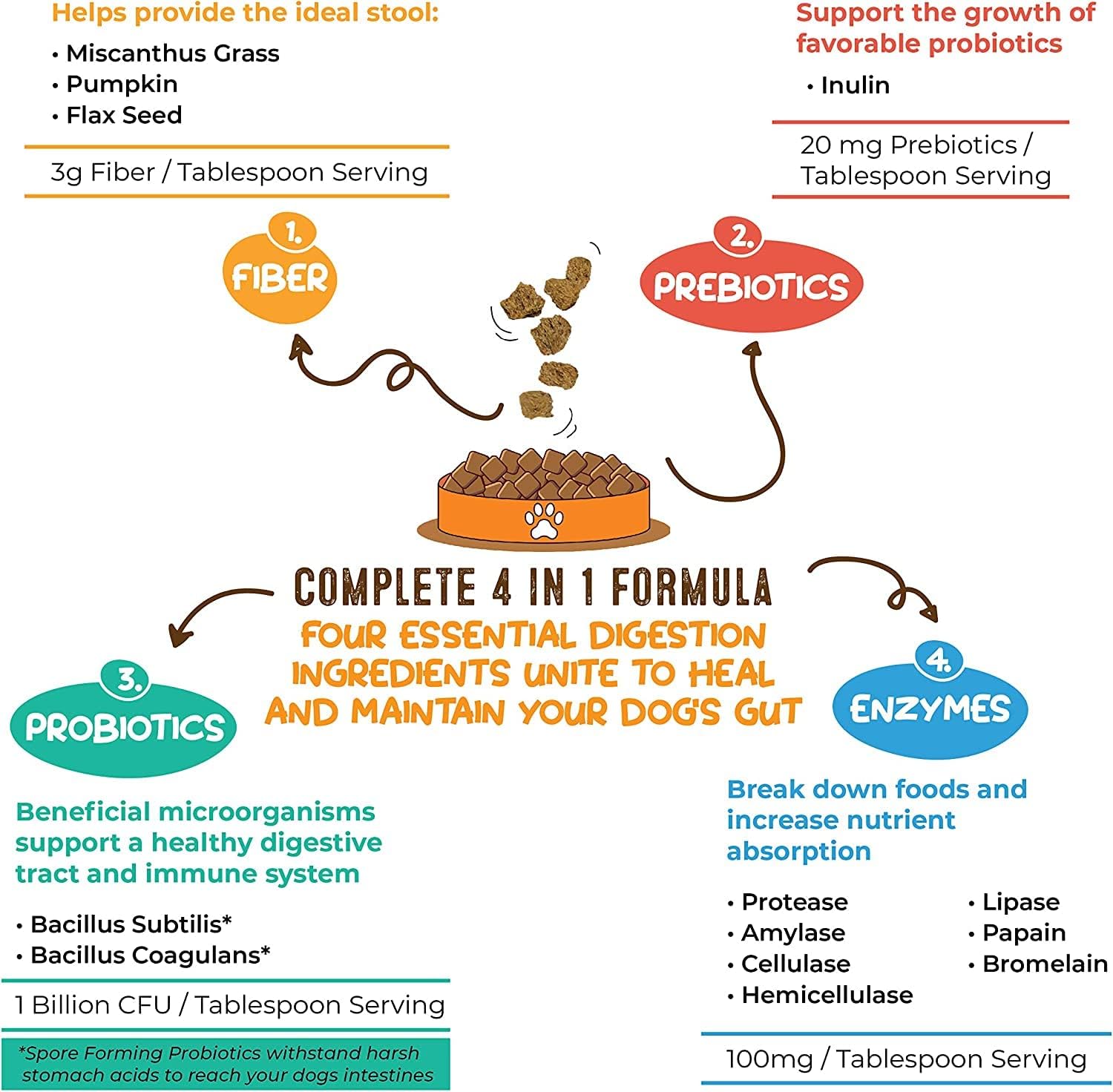 • COMPLETE 4 IN 1 FORMULA: Combines premium Fibers, Prebiotics, Probiotics and Enzymes to supercharge your pet's digestive system. These four building blocks unite to form a high fiber solution that heals and maintains your dog's gut