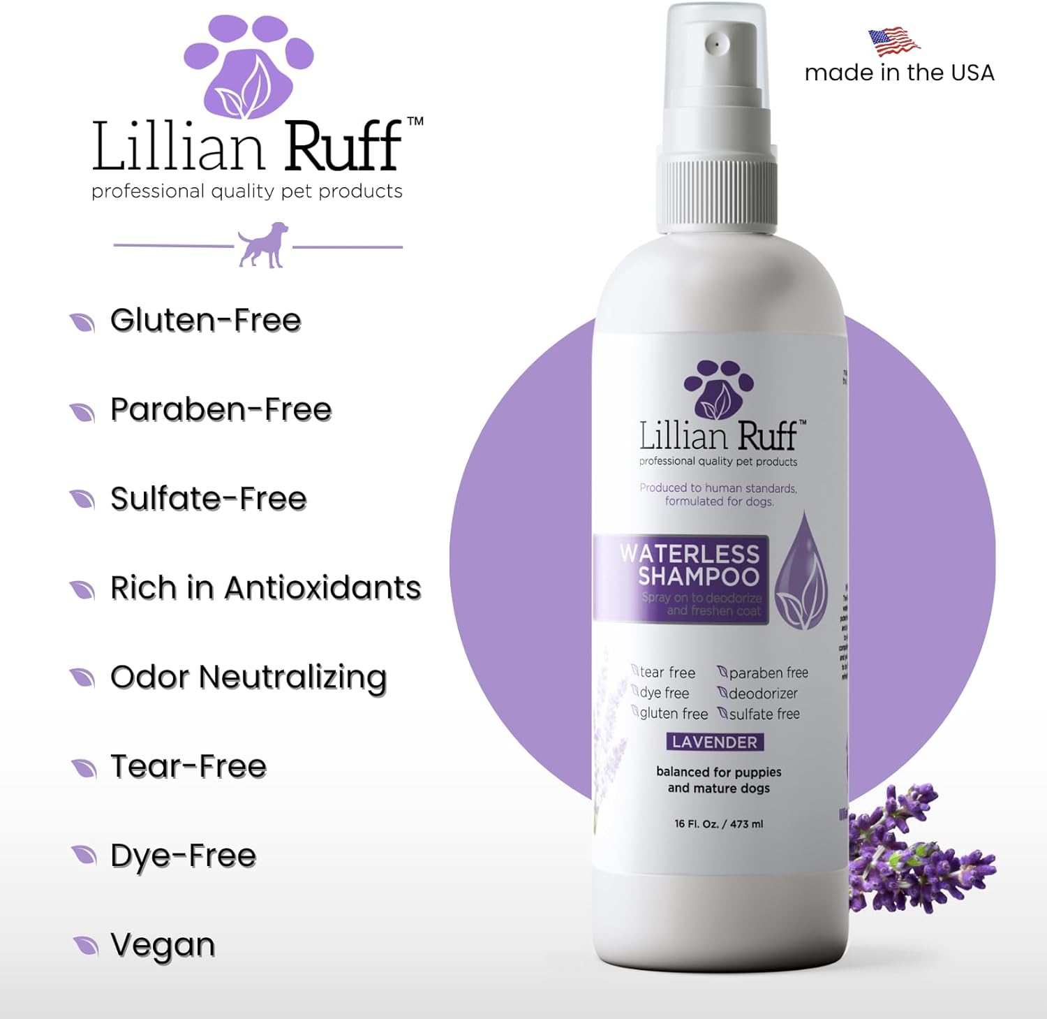 Lillian Ruff Waterless No-Rinse Dog Dry Shampoo Spray with Hydrating Essential Oils - pH-Balanced Dry Shampoo for Dogs - Clean, Condition, Detangle & Deodorize Dry, Sensitive Skin (Lavender)