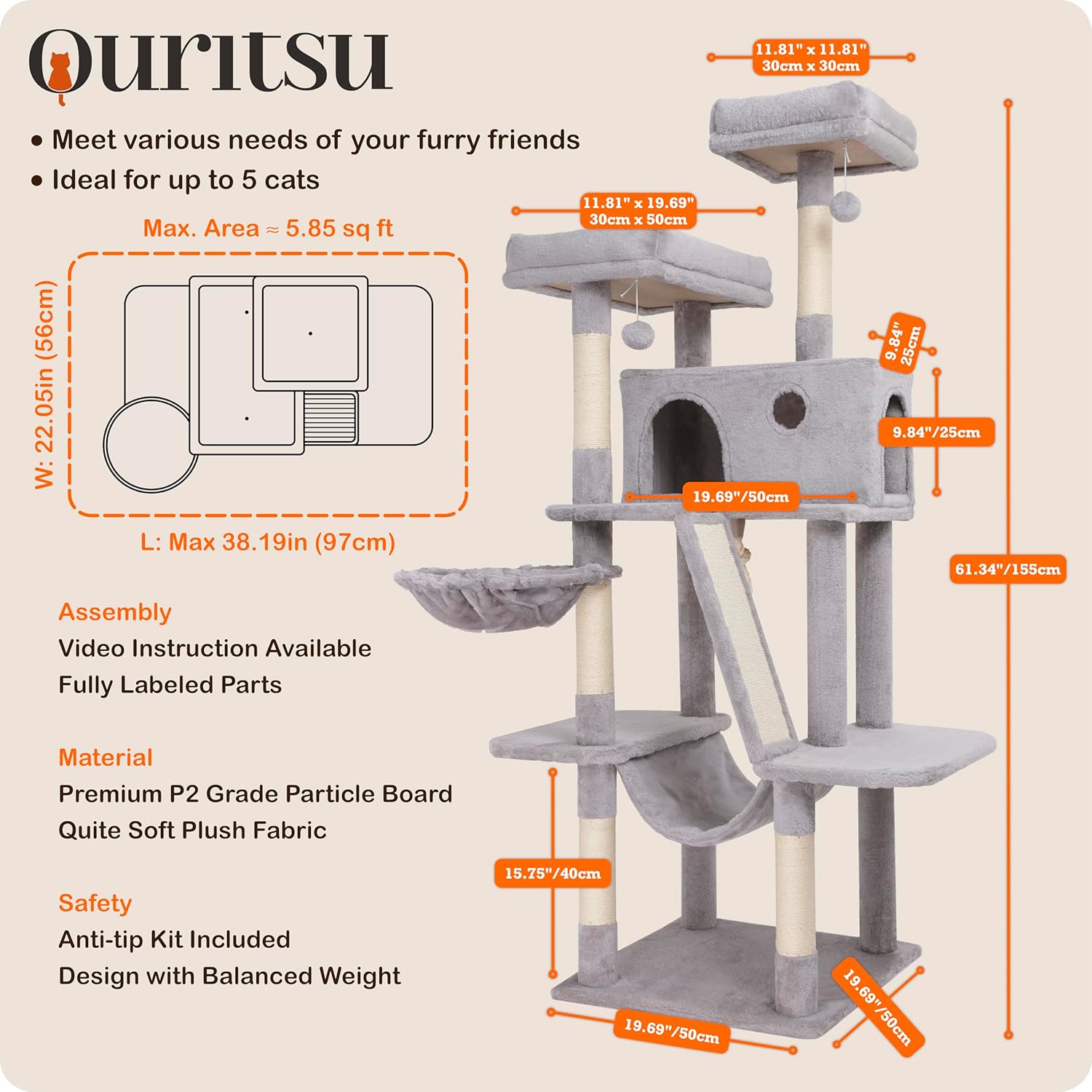 Ouritsu Cat Tree, 61 inch Tall Cat Tower for Large Cat Indoor, Enlarged Condo, 2 Padded Perches with 1 Widened, Large Hammock, Scratching Post and ramp, Fluffy Basket, Light Gray, LF002GA