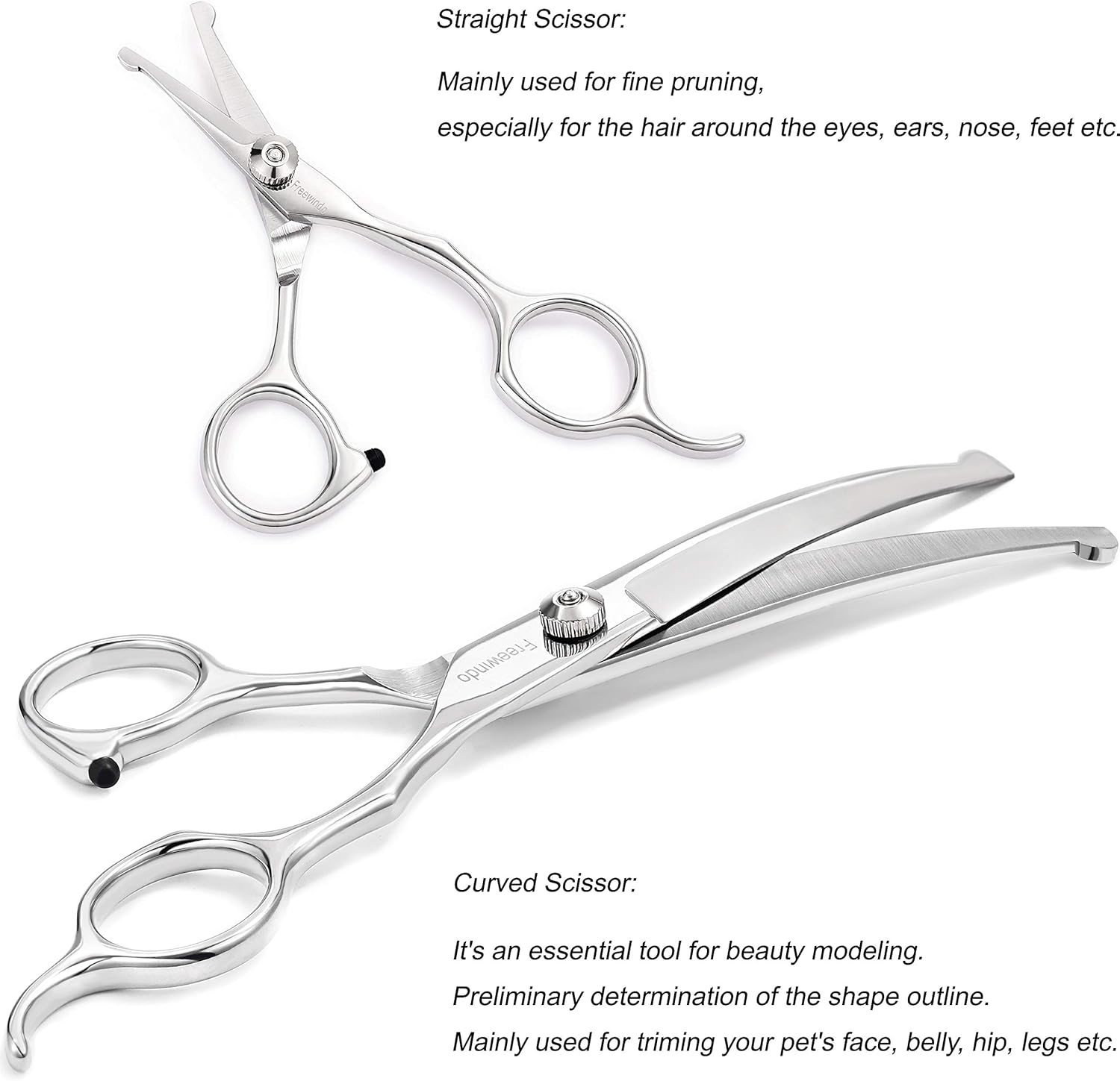• A COMPLETE DOG GROOMING SCISSORS KIT: This kit includes 1 × 7.3'' Thinning Shears, 1 × 7.3'' Curved Scissors, 1 × 5.3'' Straight Scissors, 1 × Pet Comb, 1 × Dog Nail Clippers, 1 × Dog Nail File, 1 × Cleaning Cloth, and 1 × Black Leather Case. With this scissors for dogs kit you can trim any part of your pet such as body, face, eyes, nose, ears, tail, paw etc.