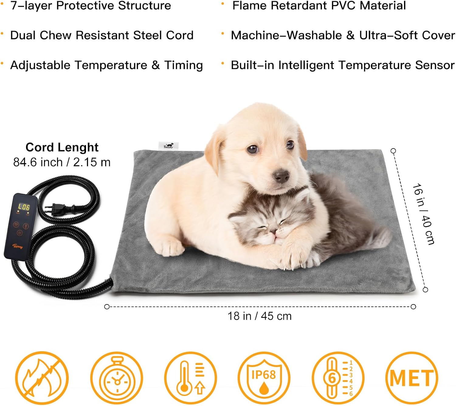 Toozey Small Pet Heating Pad, 6 Adjustable Temperature Dog Cat Heating Pad with Timer, Waterproof Heated Cat Bed with Chew Resistant Cord, Indoor Electric Pet Heated Mat 18x16in