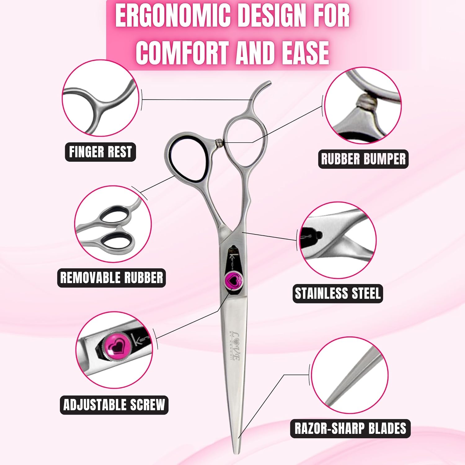 Kenchii Love Left Handed Dog Grooming Scissors, 7 Inch Straight Shears, Dog Scissors for Grooming, Professional Pet Grooming Scissors, Ergonomic & Comfortable