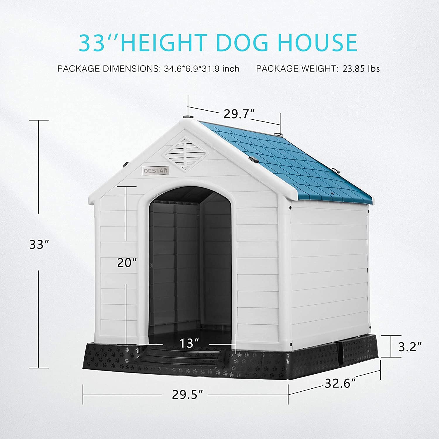 • LARGE & STURDY HOUSE - The dog house is large enough for dogs of different sizes; Please check the dimensions before buying; Overall Dimension: 32.6"(L)*29.5"(W)*33"(H); Door Dimension: 13"(W)*20"(H); The interior space is designed for small or medium pets; Made of sturdy and thick PP plastic that is anti-corrosive and anti-rust, it is durable to be used on outdoors places like patio and backyard