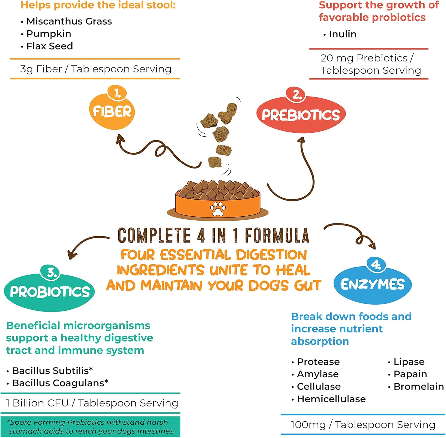 • COMPLETE 4 IN 1 FORMULA: Combines premium Fibers, Prebiotics, Probiotics and Enzymes to supercharge your pet's digestive system. These four building blocks unite to form a high fiber solution that heals and maintains your dog's gut