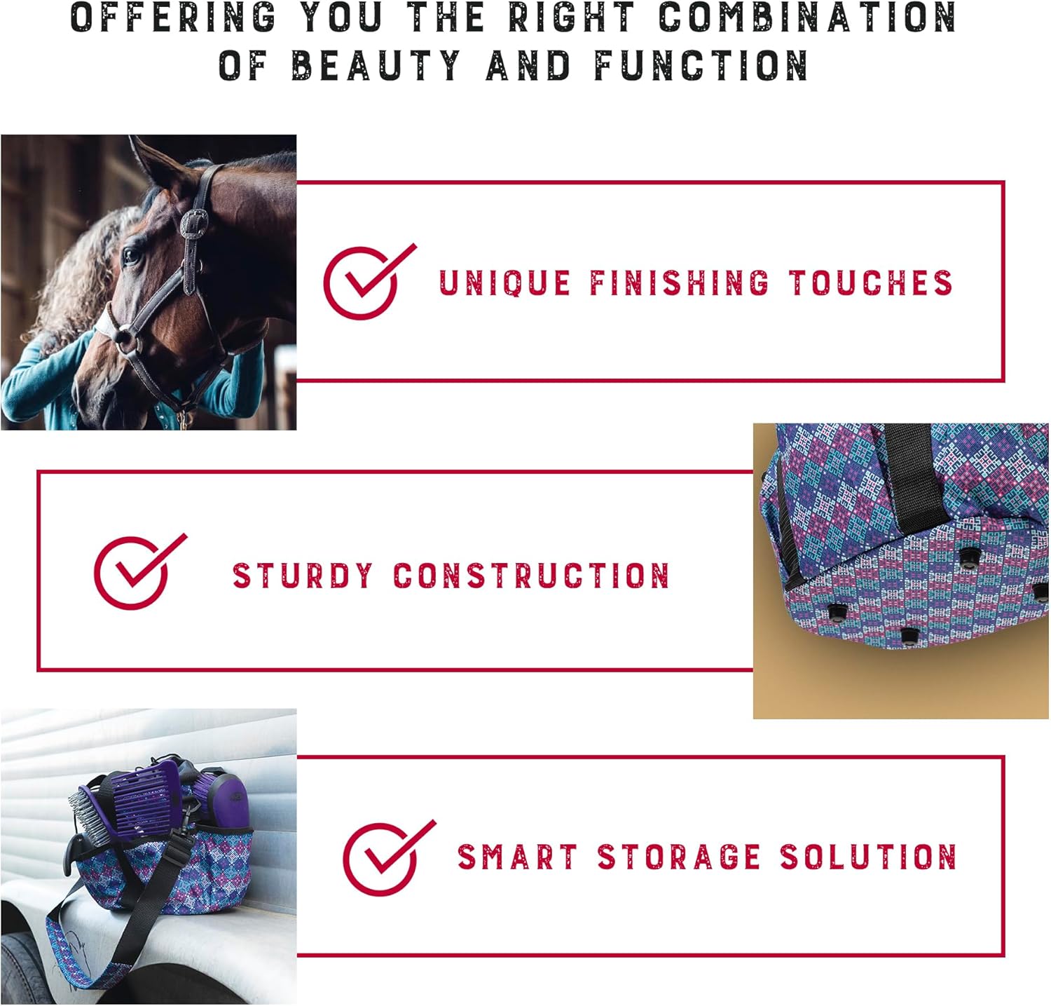 • Comfortable and Portable: Designed for easy use, the adjustable grooming bag for horses includes comfortable webbing handles and soft padded shoulder strap with on and off snap; effortlessly carry this lightweight equine grooming kit wherever you go