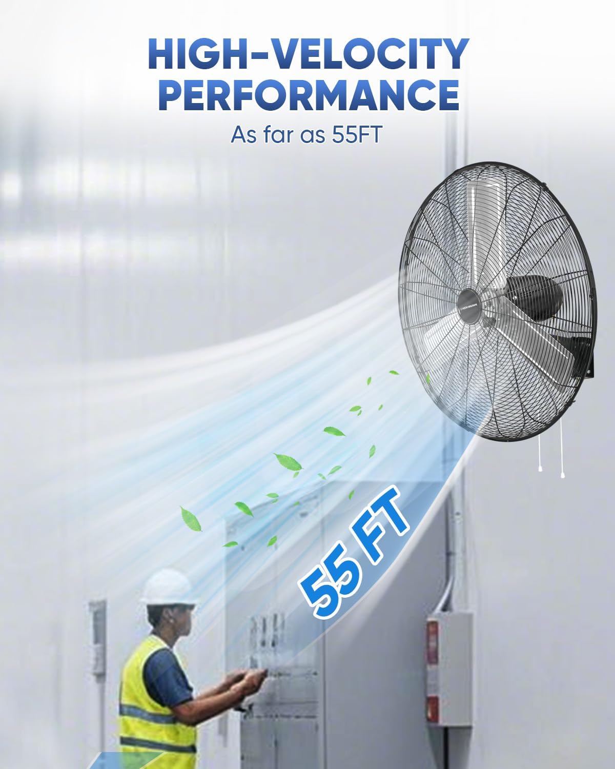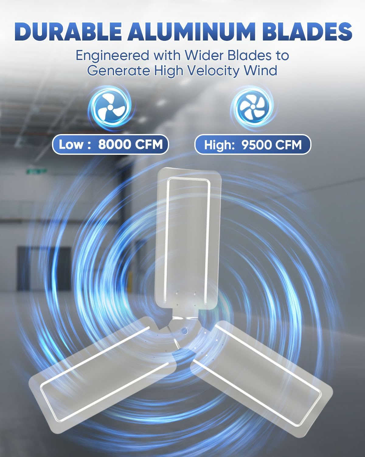 • Superior Airflow Performance. This high-velocity fan delivers up to 7497 CFM on high speed with 2-speed settings. Featuring 90° oscillation and 60° vertical tilt, it ensures efficient cooling and wide air circulation for large spaces.