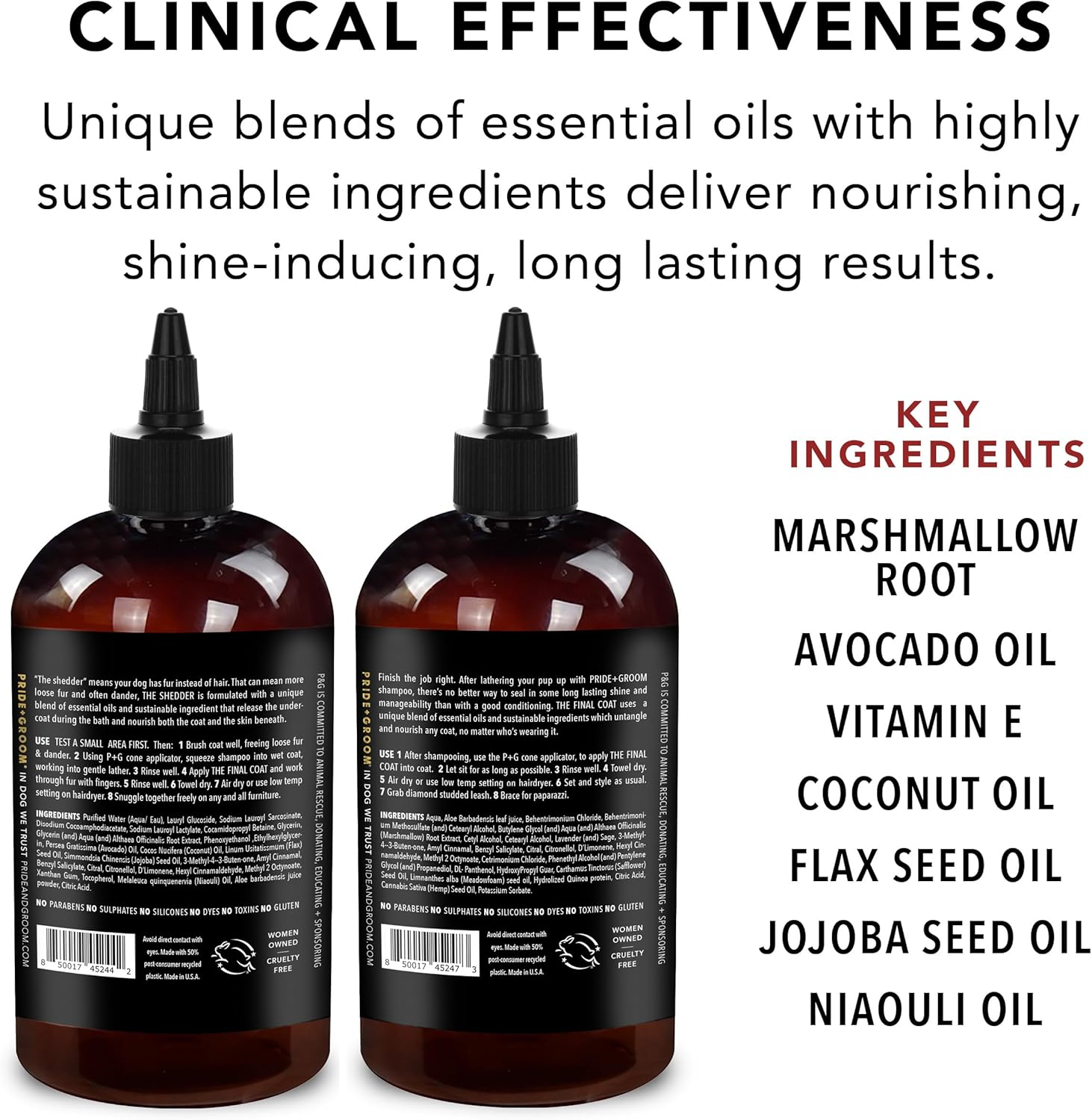 • PRIDE+GROOM BOX SET: Beautiful gift box that includes THE SHEDDER shampoo and THE FINAL COAT conditioner packed with essential oils & moisturizing ingredients for deshedding fur coats.