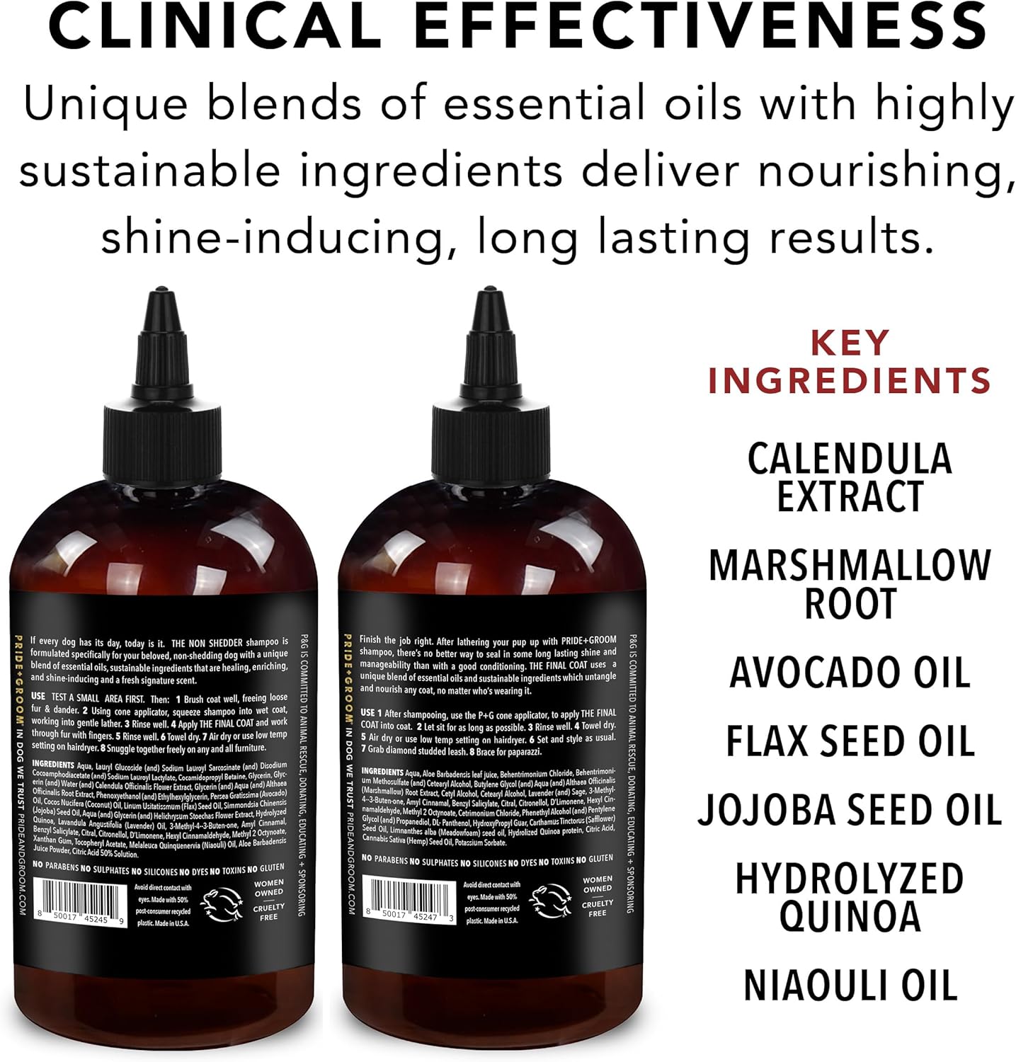 • PRIDE+GROOM BOX SET: Beautiful gift box that includes THE NON SHEDDER shampoo and THE FINAL COAT conditioner packed with essential oils & smoothing ingredients for a non shedder’s hair coat.